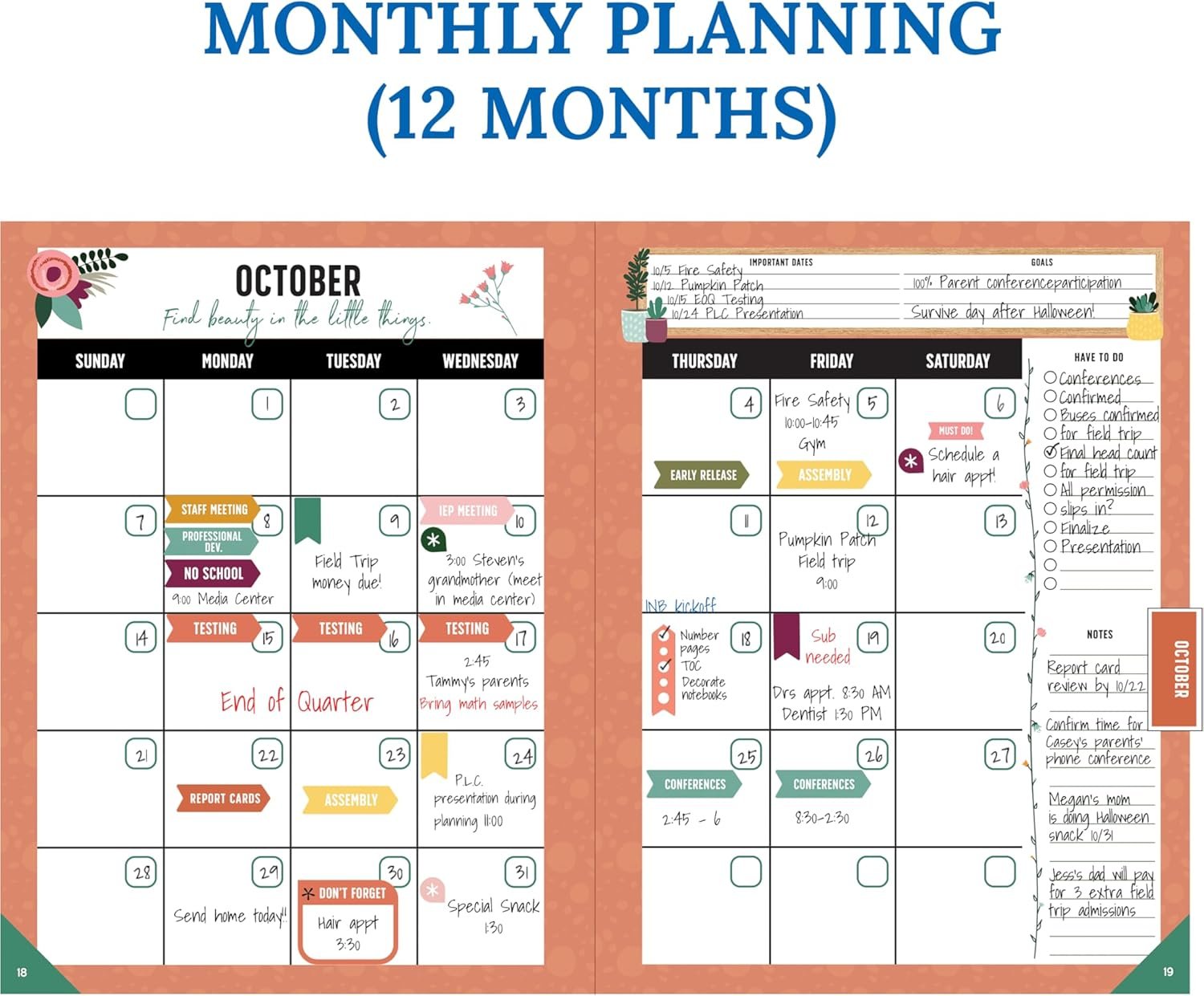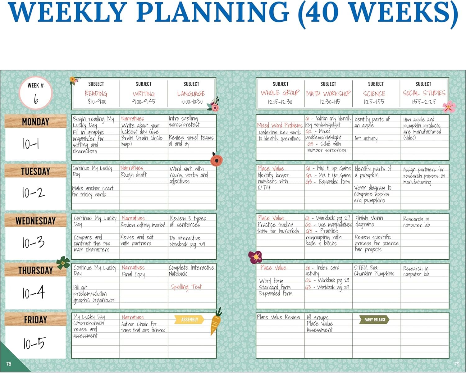 Classroom Organization: Organize schedules, lesson plans, classroom curriculum, and more. Use the checklists in the daily, weekly planner, and monthly planner to track grades, attendance, and homework completion.