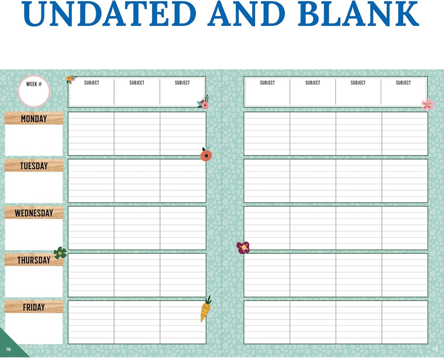 Includes Monday–Friday undated weekly planner pages for up to 7 subjects for 40 weeks.