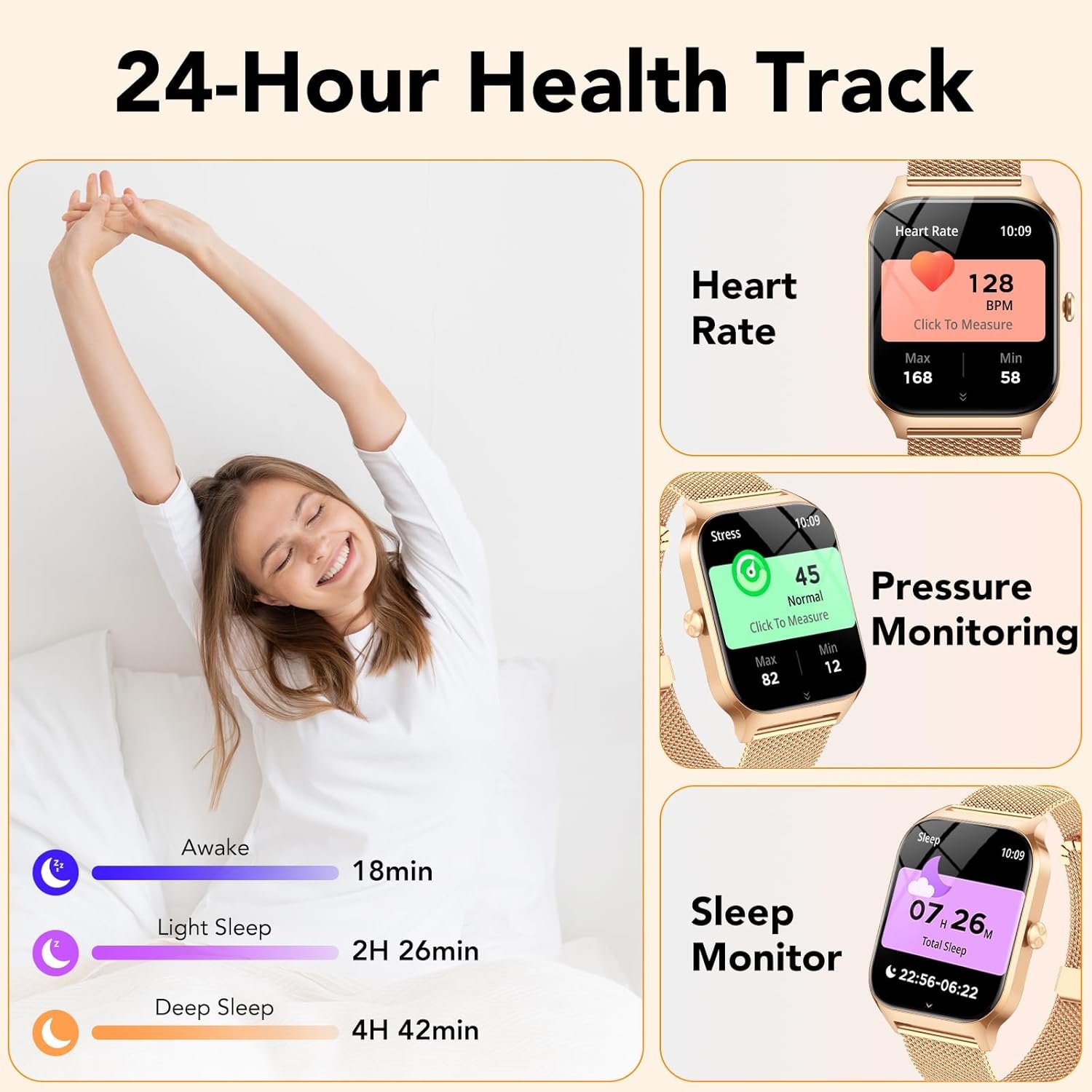 【24/7 Health Monitoring】The smartwatch women incorporates the latest touchscreen chip, a high-sensitivity G-sensor and PPG heart rate sensor to accurately monitor heart rate and sleep patterns. The sleep tracker activates automatically overnight, providing comprehensive sleep quality analysis (deep sleep, light sleep and wakefulness). The android smart watch also features stress detection and female menstrual cycle tracking, thoughtfully safeguarding your wellbeing.