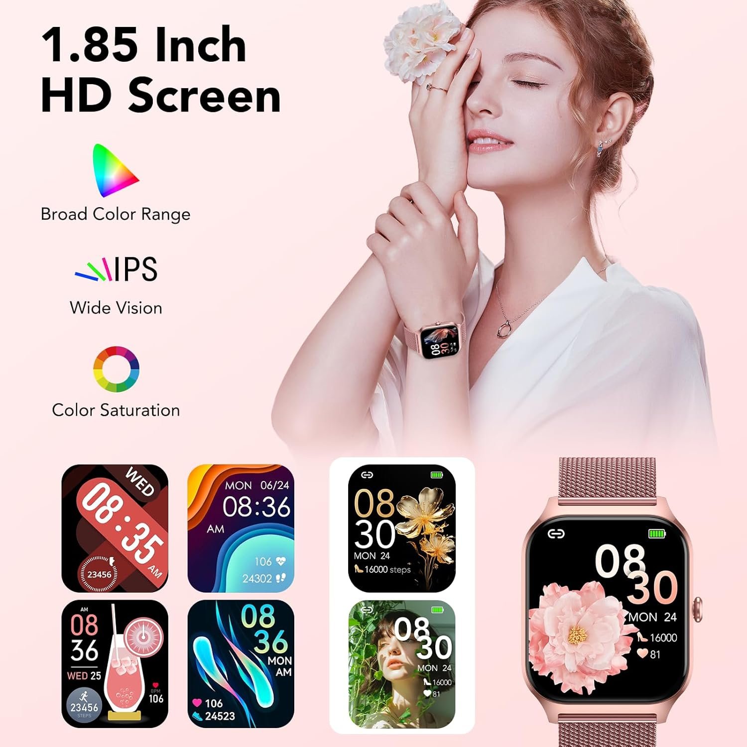 【1.85-inch HD Screen】This smart watches for women features a 1.85-inch ultra-clear display paired with 3D tempered glass, delivering a 240*284 resolution for exceptional clarity and a wider viewing experience. With a slim 11mm thickness and lightweight 39g design, it ensures all-day wearing comfort without any burden. It supports brightness adjustment, maintaining clear visibility even in strong sunlight. Through the “Da Fit” app, you can choose from 200 + stylish watch faces or customize your own exclusive design, easily creating a personalized style.