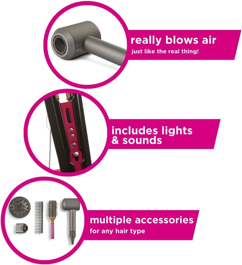 WHAT’S INCLUDED: This playset includes the Supersonic hair dryer toy, the Corrale straightener replica toy, a nozzle, a diffuser, a barrel brush, and a detangling comb. Compatible with the Casdon Ultimate Styling Case (sold separately)