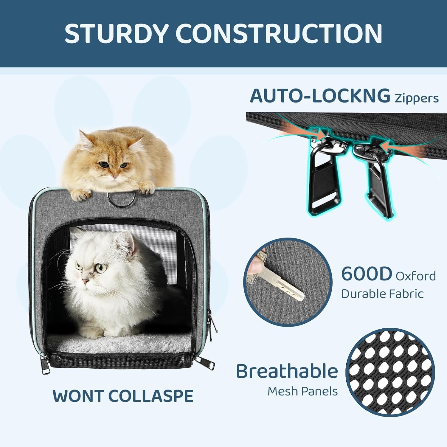 High-quality 600D Oxford cloth fabric along with the sturdy interior steel frame for durable construction. Roll-up mesh top entrance with Velcro and side zippered openings make it easy to load your kitty and provide a stress-free travel environment