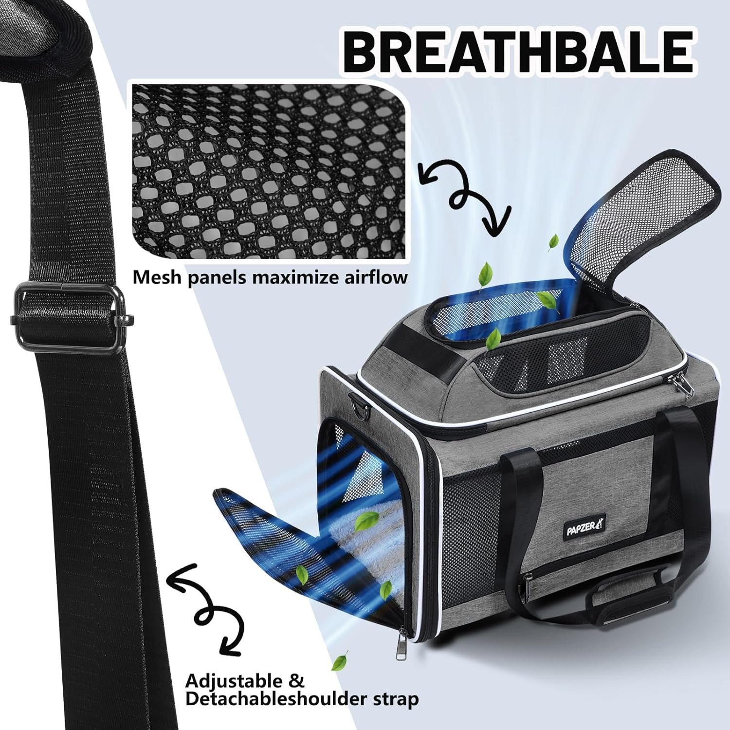 EXPANDABLE AND COLLAPSIBLE TOP – Measuring 18 x 11 x 11 inches (LxWxH), our sturdy cat carrier features an innovative pop-up top that adds an extra 3.5 inches of height, reaching a total height of about 14 inches when fully extended. It can be conveniently compressed to slide under the seat, while also providing your pet with sufficient headroom to stretch or stand during travel