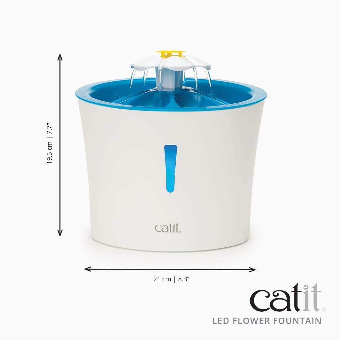 Style:LED Light Flower Fountain The new Catit LED flower fountain is based on the successful Catit Flower fountain and has a fresh, unique design that allows up to 3 different water flow settings to appeal to picky drinkers! Drinking regularly is important for your cat’s health as it helps prevent urinary tract diseases, which is a common health issue for cats. (This product is not designed To cure any disease or illness.) when plugged in without accessories, The flower fountain provides a gently flowing water surface. Inserting the flower accessory creates long, faucet-like streams of water. The flower is easy to add to (or remove from) the fountain. Adding the flower cap will tone down the bubbling water on top, so give this setting a try if your cat would rather play with the water than drink from it. The Petal top enables your cat to drink even when the fountain is turned off. This fountain features a handy water level indicator window and a LED nightlight. The flower fountain is easy to disassemble and clean and has an ergonomic design. Only for use with Catit triple action filters. Other filters are less efficient and might even damage your LED flower fountain. Rinse the filter thoroughly and submerge it in water for 10 minutes before use. Low power usage. Bpa-free (all components excluding adapter).