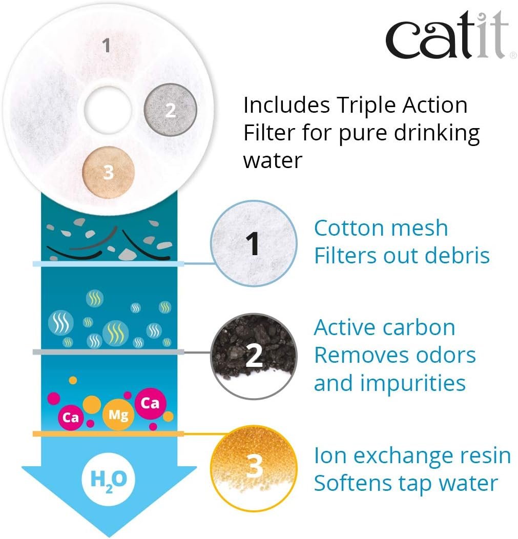 Includes triple action softening cat water filter and small energy-efficient pump with power cord (if an extension cord is necessary, connection must be watertight and dust proof); made of BPA-free materials