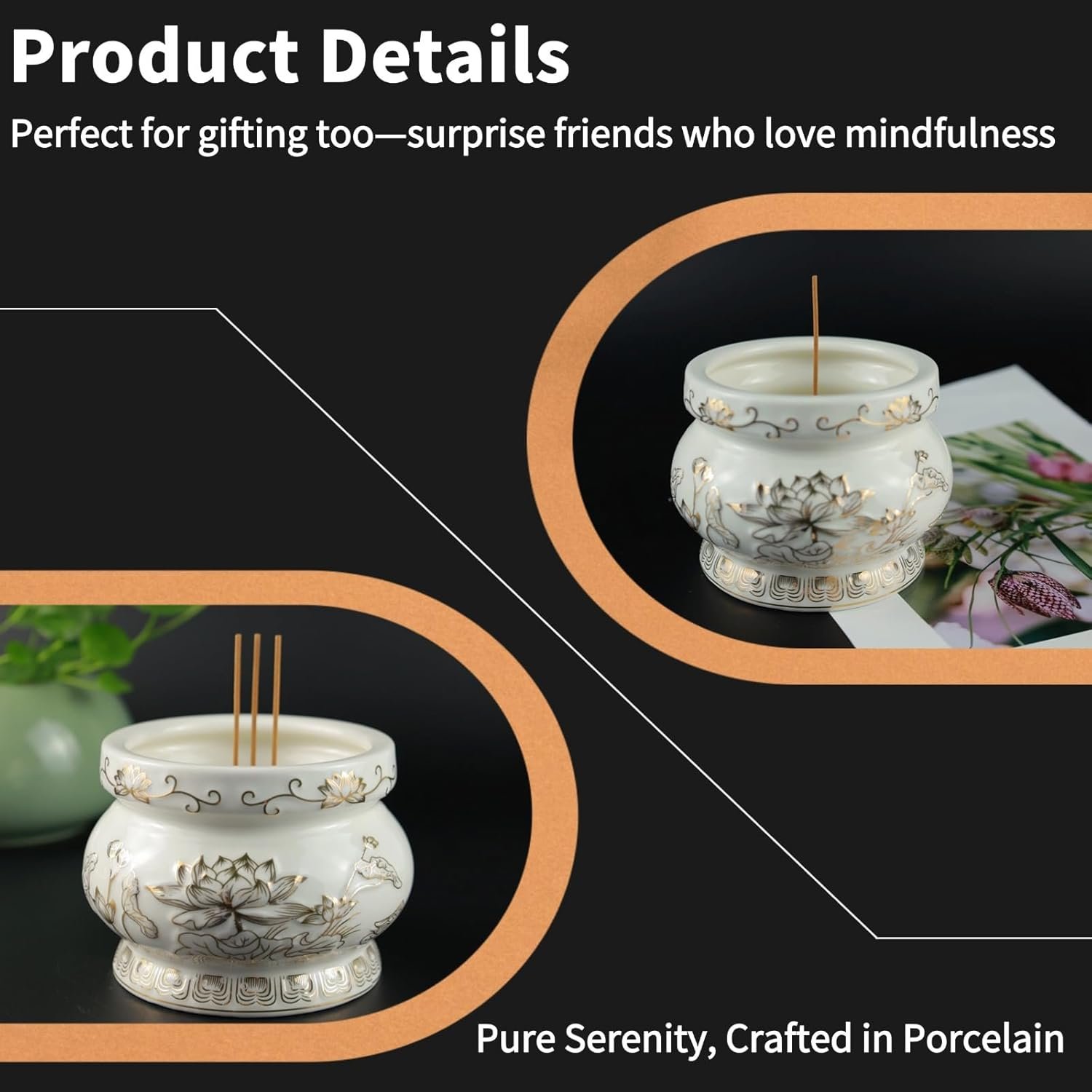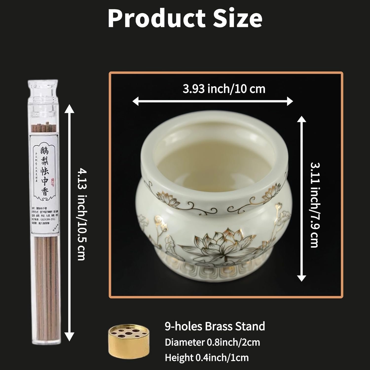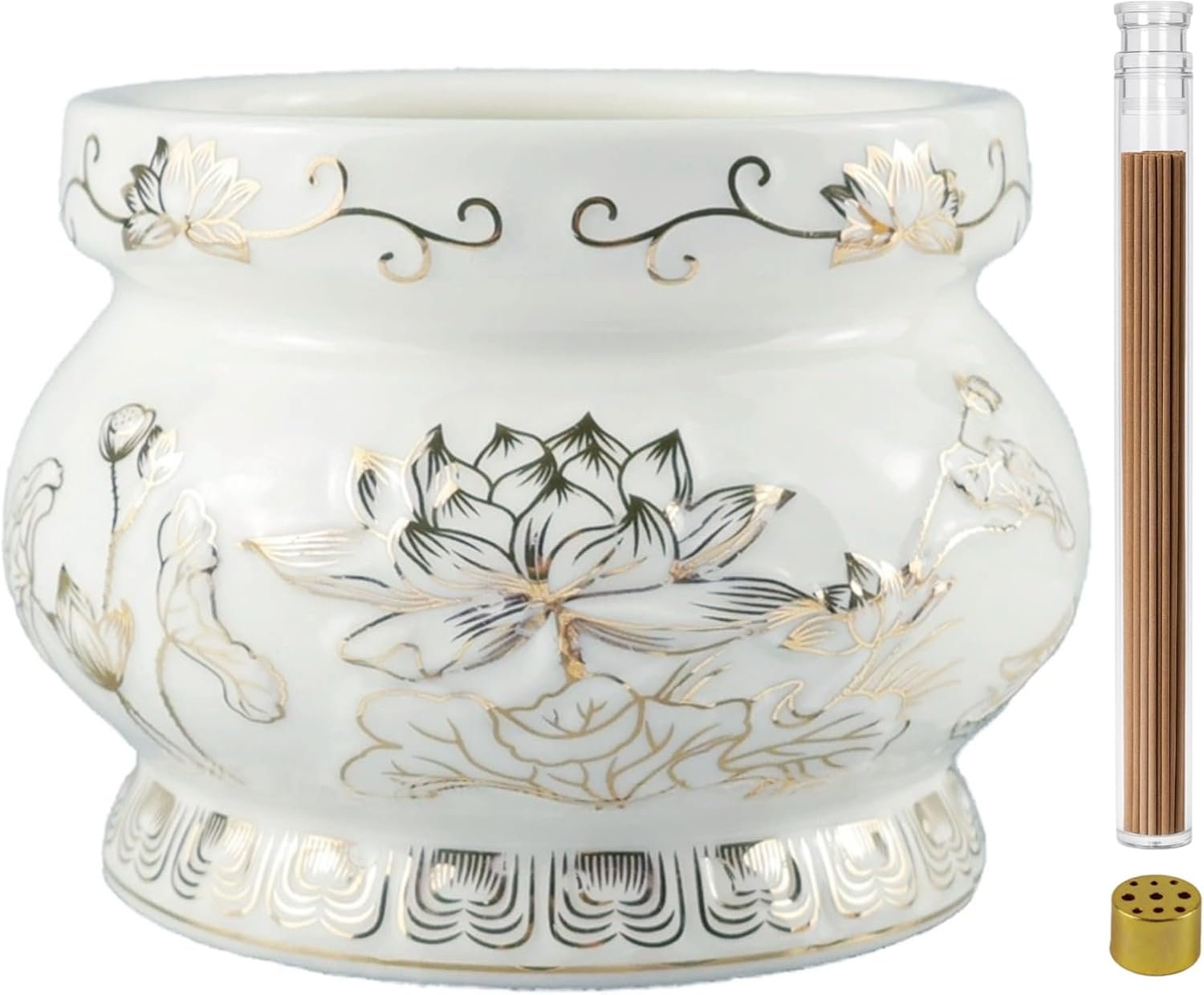 Incense Pack ALL in One: The ceramic incense holder set includes 1 uniquely designed censer, 1 brass incense stand with 9-holes and 1 box of sticks. You just need to buy one and get this full pack, the ceramic incense burner with golden painted lotus patterns also brings you a relaxing atmosphere in any space, soothes your emotions and provides a sense of healing for your spirit