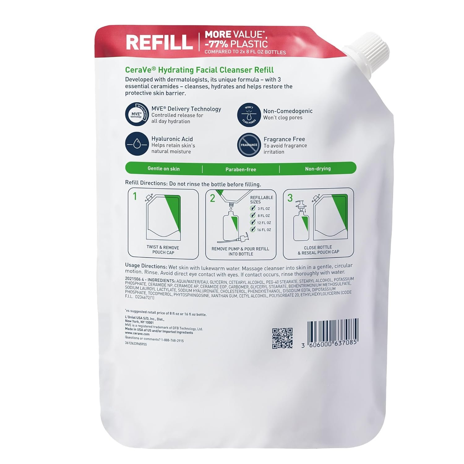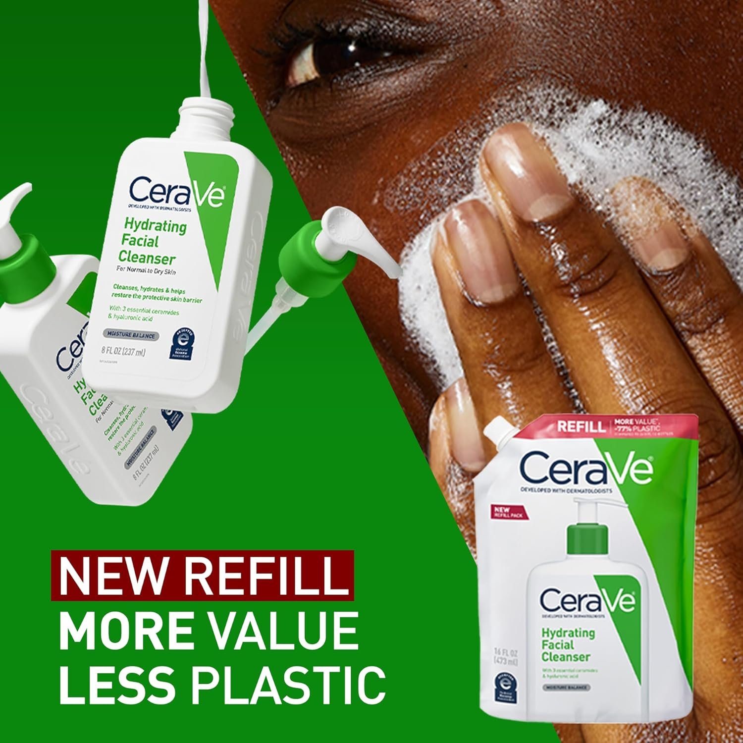 [ HYDRATING FACE WASH ] Daily face wash with hyaluronic acid, ceramides, and glycerin to help hydrate skin without stripping moisture. Removes face makeup, dirt, and excess oil, provides 24-hour hydration and leaves a moisturized, non-greasy feel. Now available in a refill format.
