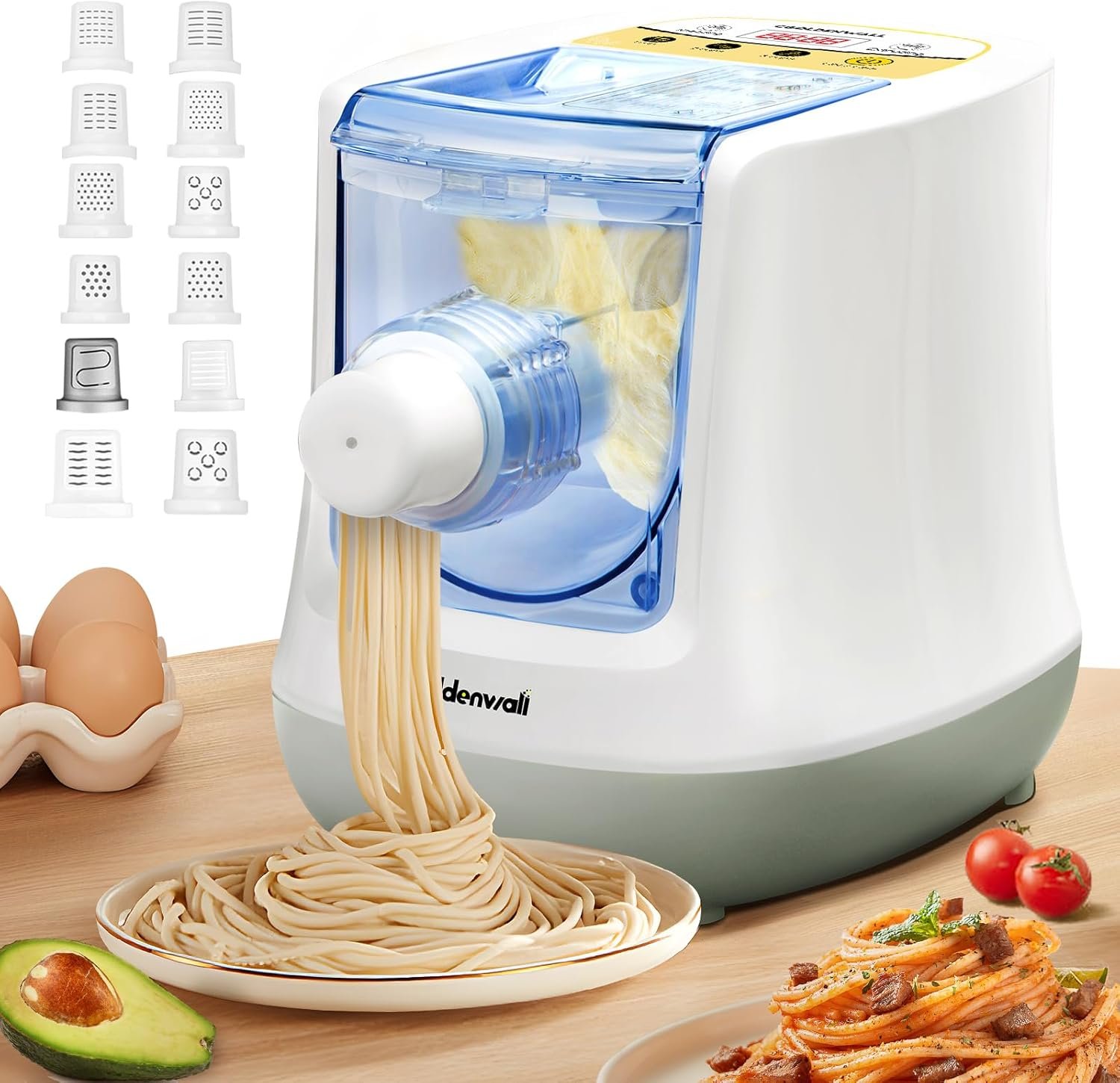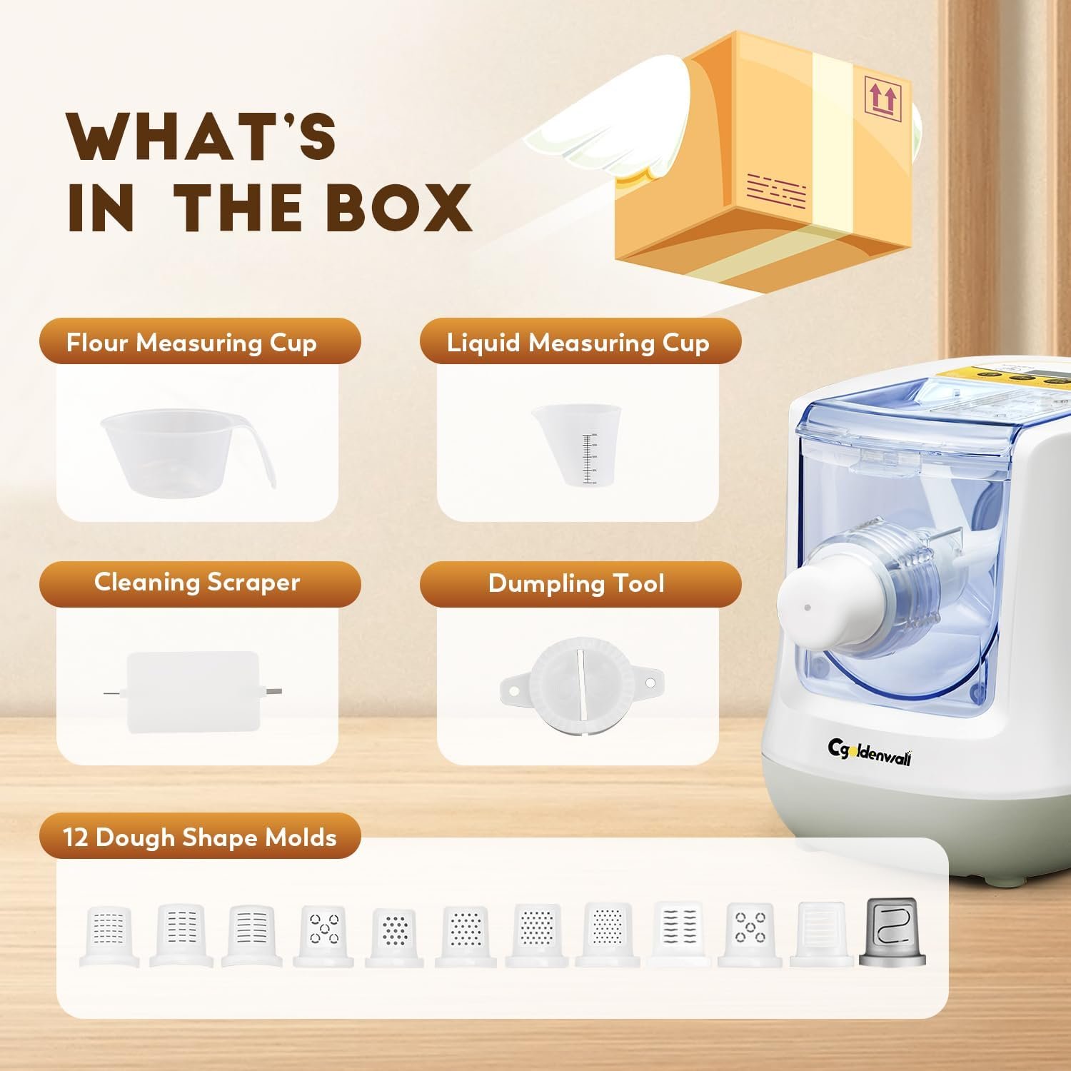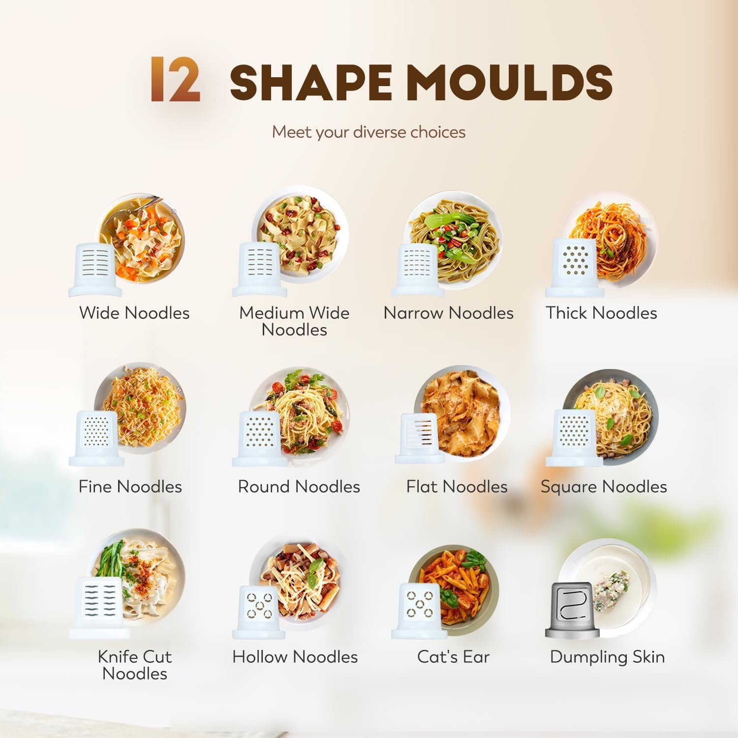 DIVERSE OPTIONS – This household pasta maker comes with 12 dough shape molds and 2 measuring cups. You can choose to make various types of noodles according to your taste preferences, such as wide and thin noodles, spaghetti, dumpling skins, macaroni, and knife-cut noodles.
