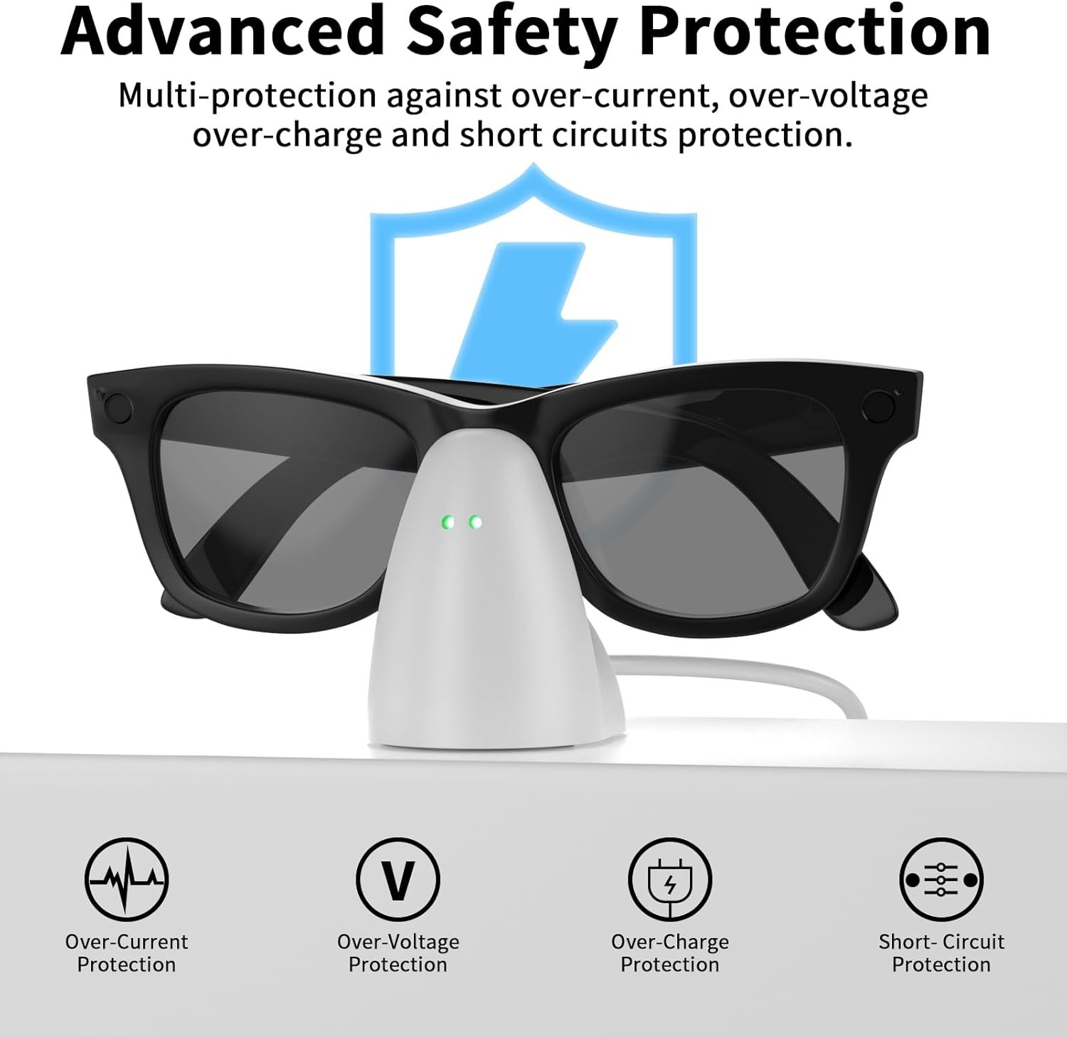 Smart & Safe Charging: The ray ban meta charger built-in safety chip effectively resists potential risks such as overvoltage, overheating, and short circuits, providing all-round safety protection for your RayBan Meta Glasses. It also automatically matching check before each charge to ensure safe and accurate charging. If the indicator turns red, just adjust the glasses’ position to resume normal charging