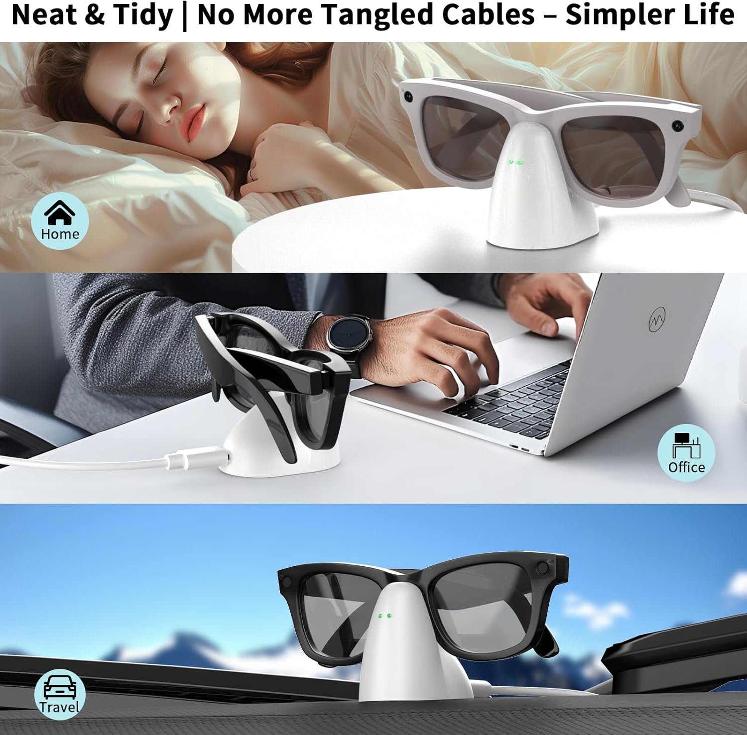 Stable Base & Premium Construction: This ray ban meta gen 2 glasses accessories crafted from high-quality materials with a smooth, refined surface, it comes with a weighted, non-slip base that keeps it stable and prevents slipping during use. It also avoids scratches caused by direct contact between the lentes meta glasses and the desktop. Supports plug-and-play for easy operation, and includes a 59-inch long USB cable for flexible charging distances—effortlessly charge your meta smart glasses anytime, anywhere