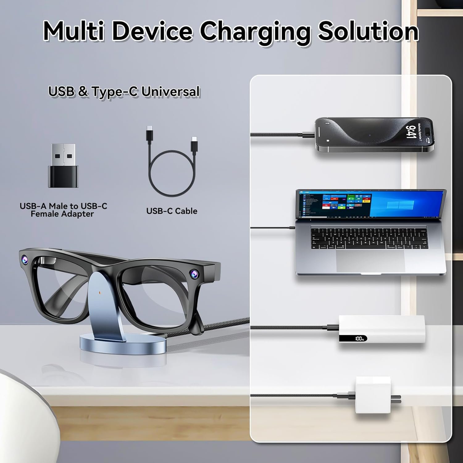 【Designed Specifically for Ray-Ban Mate Smart Glasses】 The ray ban meta charger stand is specially designed for Ray-Ban Mate smart glasses, compatible with Wayfarer, Headliner, Skylar, and Oakley HSTN. The package includes one rayban meta charger dock, 3.9ft charging cable, USB C to USB adapter, and a user manual.