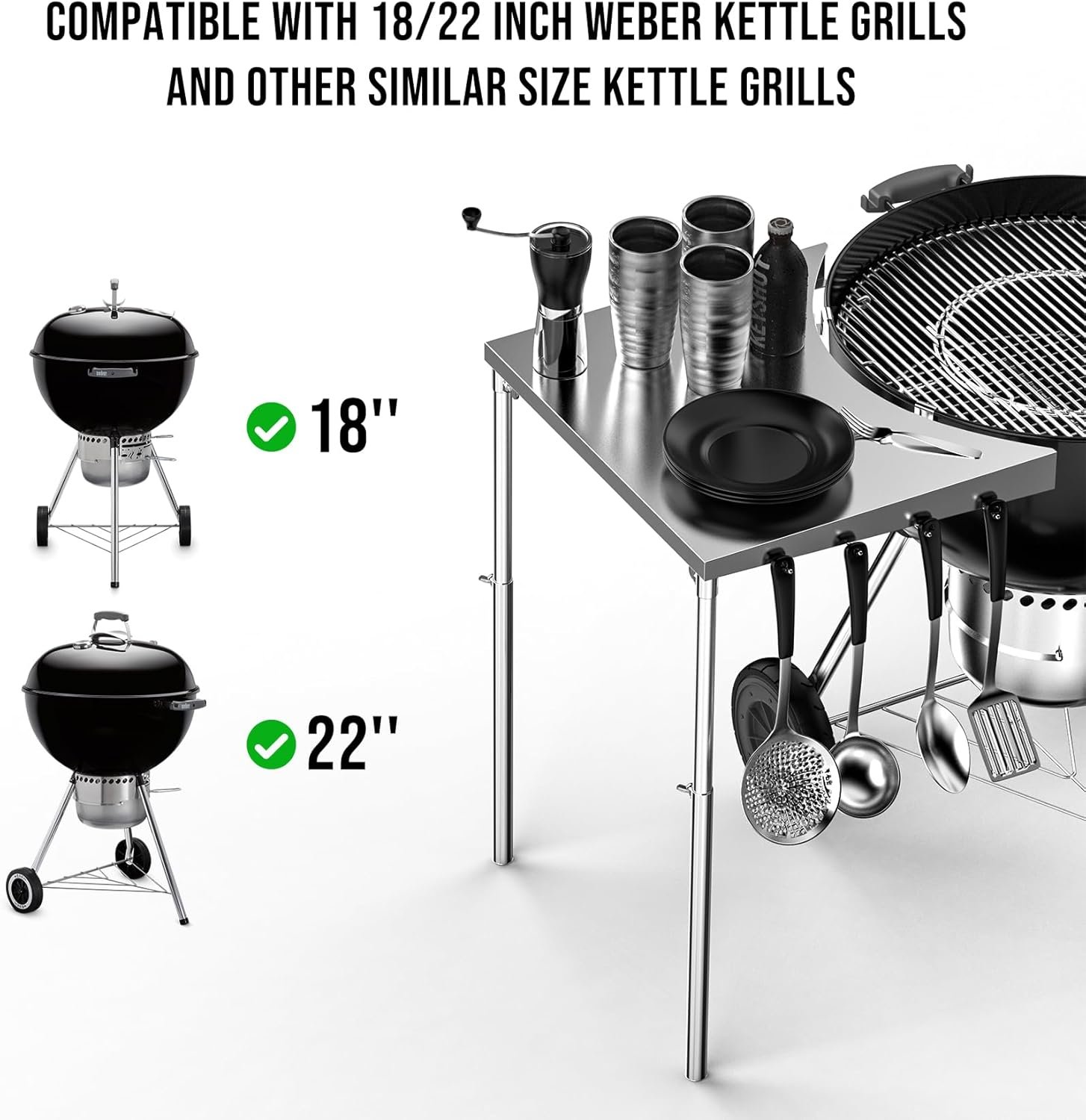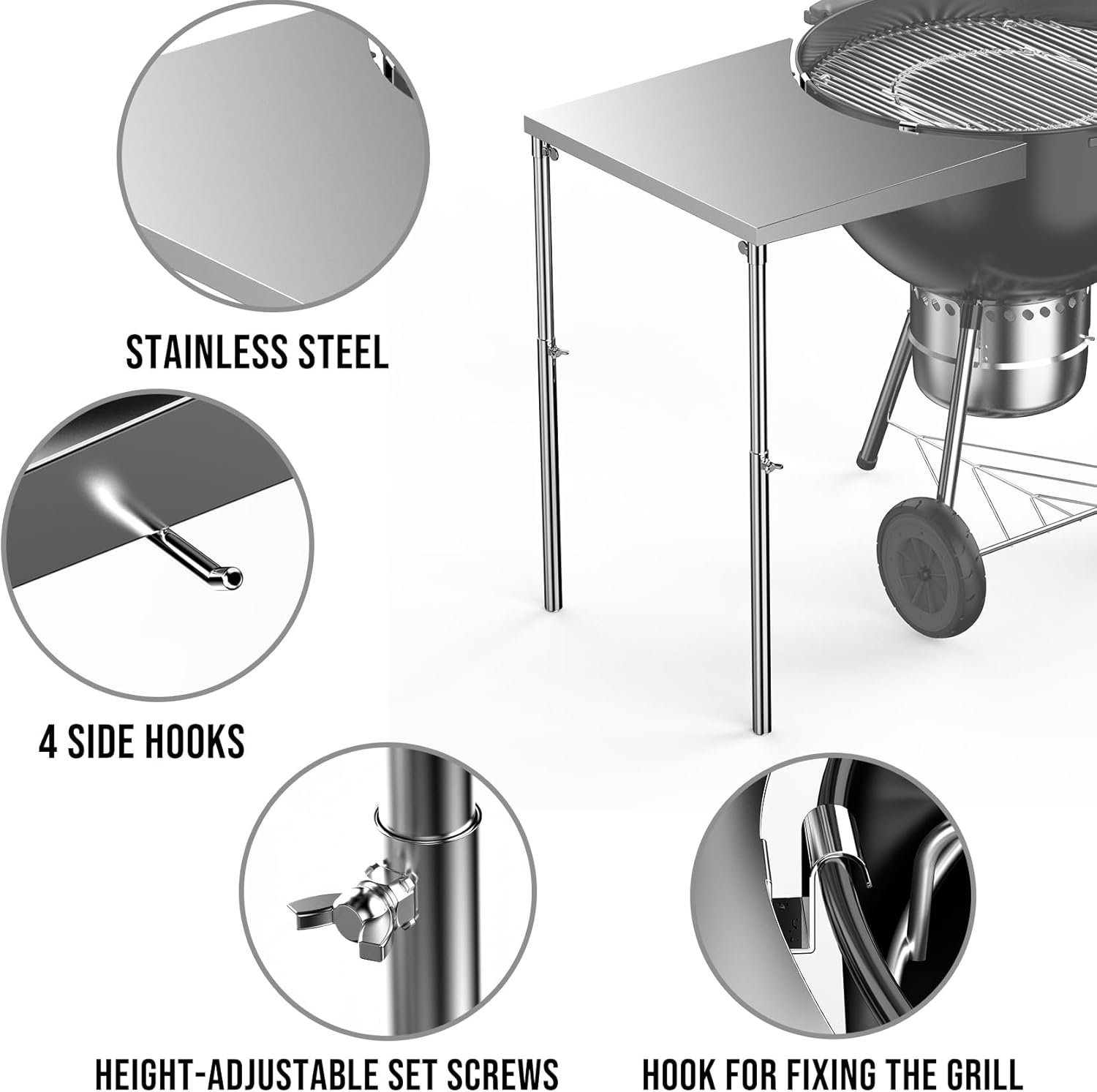 Adjustable Height – Adjustable height range from 19” to 33” allows the kettle table to fit a variety of grill heights, two legs for enhanced stability