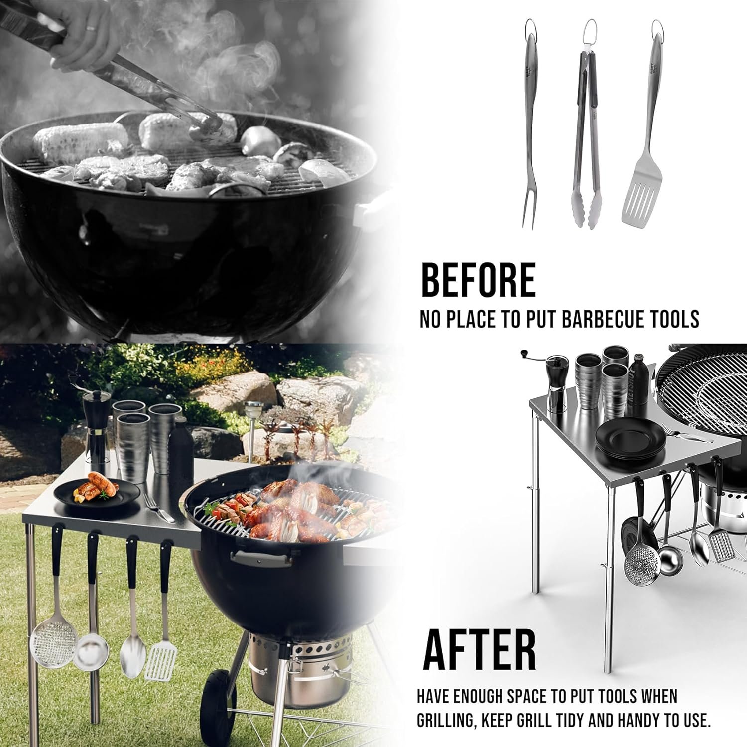 A good barbecue grill side shelf helps expand your grilling space outside, it can accommodate the plates, spice bottles, meats, etc., so you can keep your grilling accessories at hand. You can even use two of the shelves at the same time and place one shelf on each side of your charcoal grill.