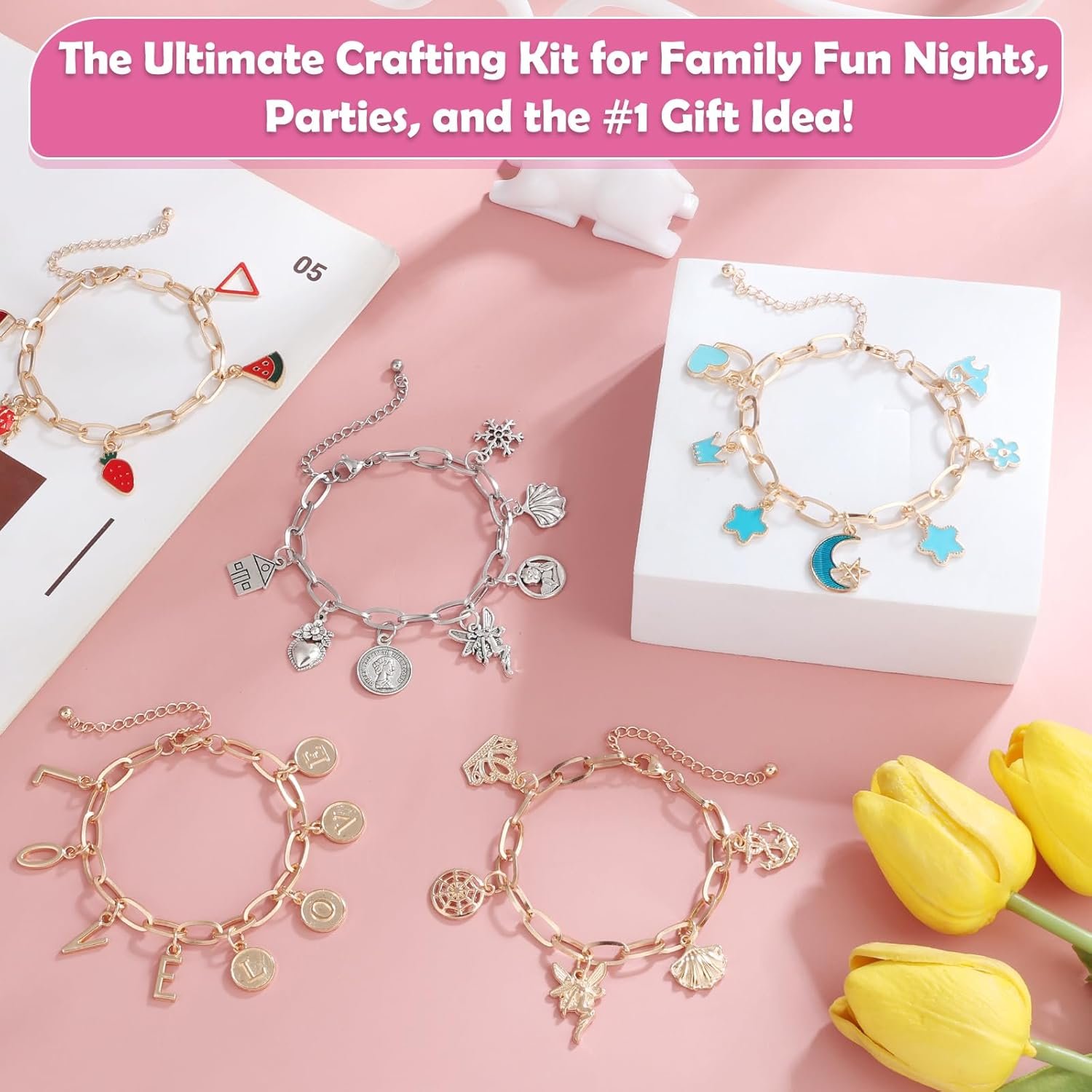 π Premium Quality & Organized Storage: All components in this charm bracelet kit are made from high-quality, skin-friendly materials. The entire charm bracelet making kit is neatly packaged in a clear plastic case for easy organization and portability.