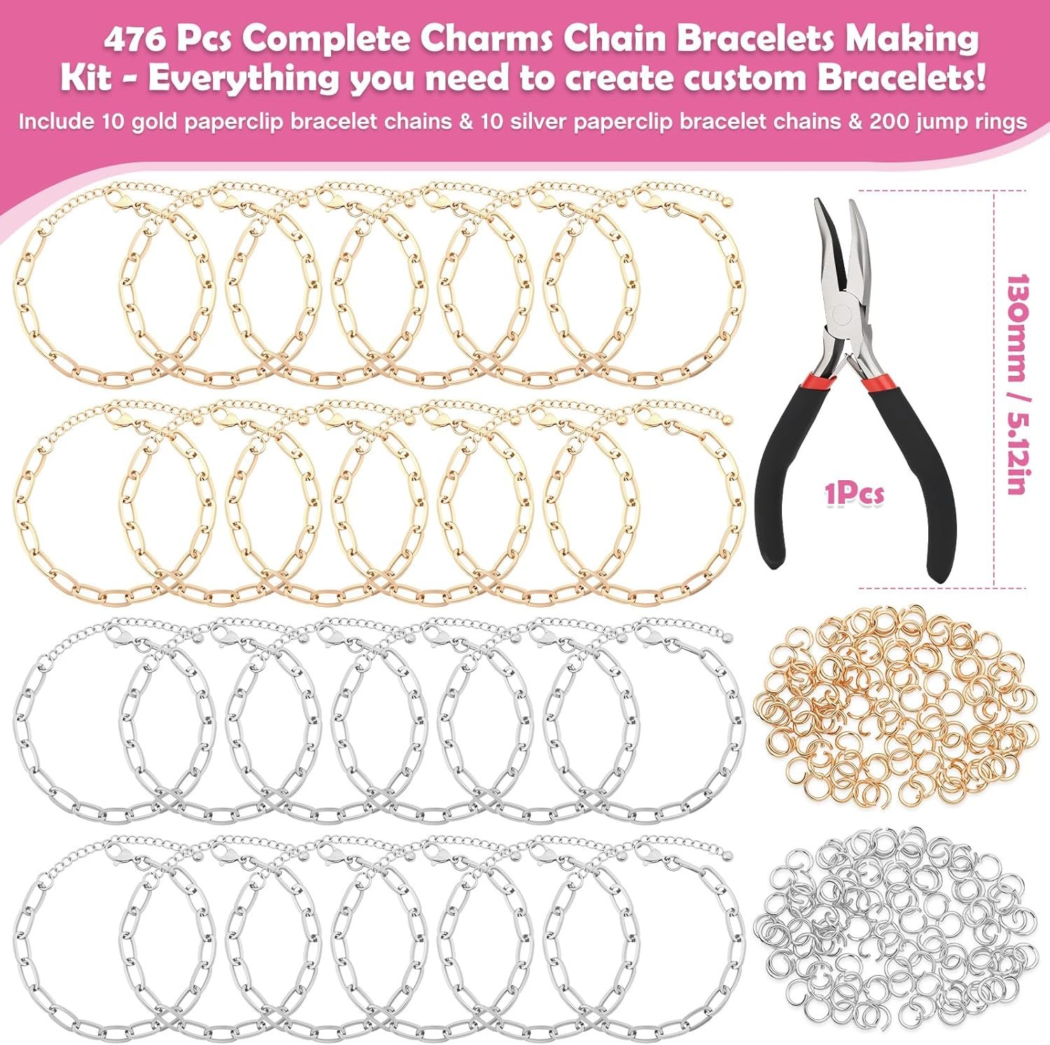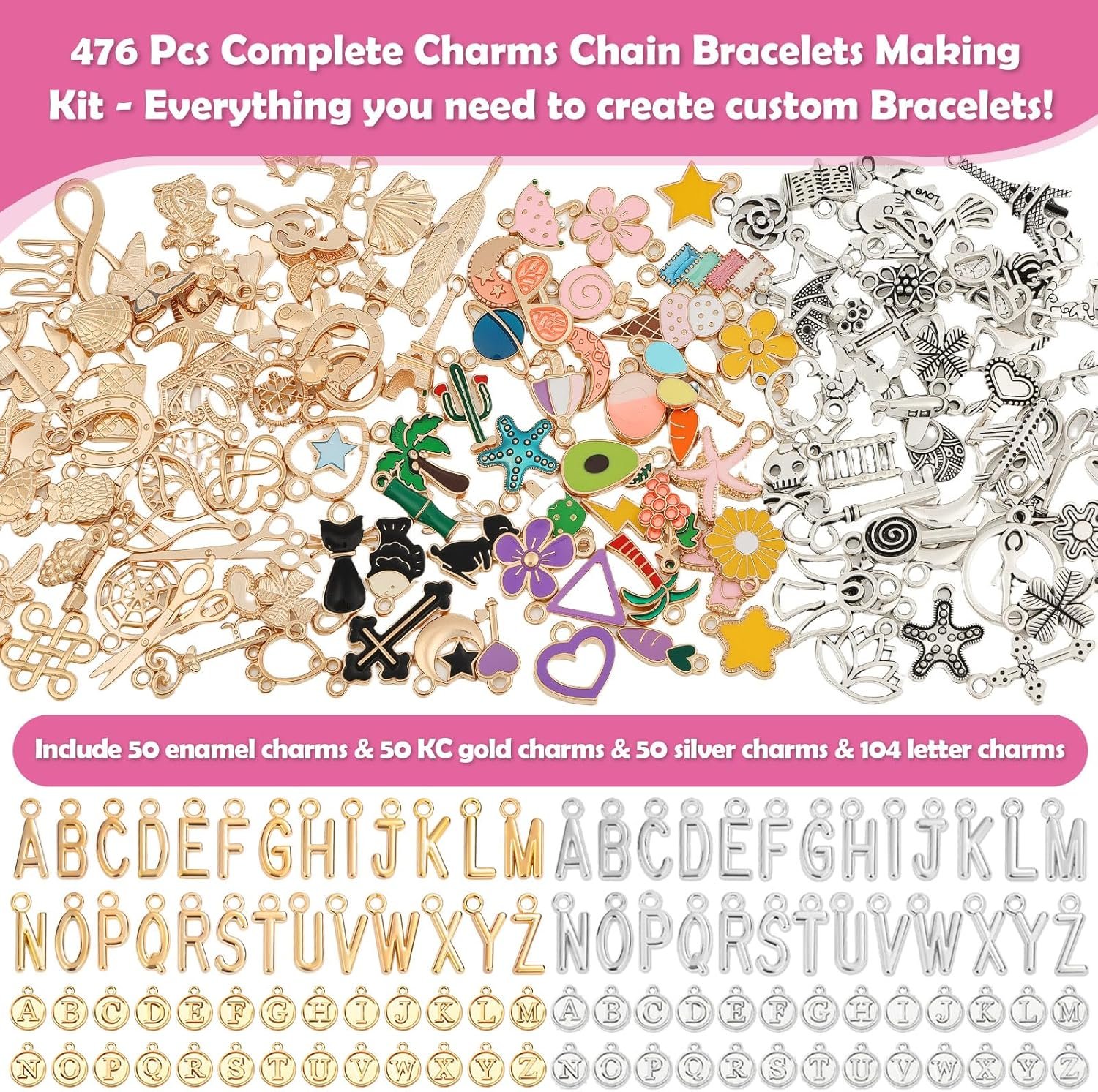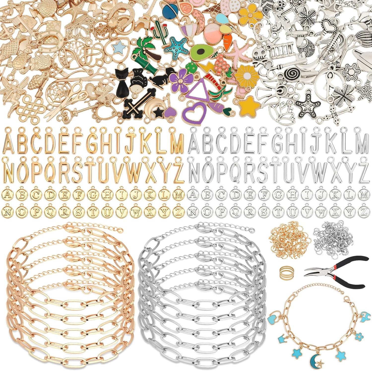 π Complete DIY Charm Bracelet Making Kit: This all-in-one charm bracelet set includes everything you need. You get 20 paper clip bracelets, 150+ assorted pendants & charms, 104 letter charms, 200 split jump rings, a plier, and a ring. Perfect as a bracelet making kit with charms for endless creativity.