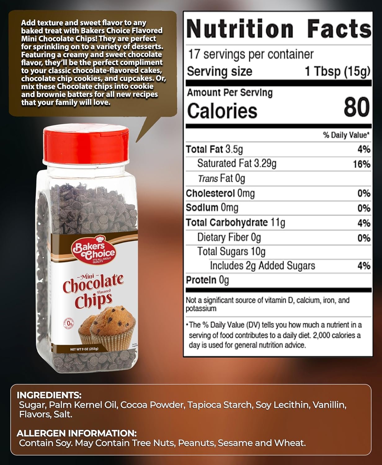 Chocolate Flavored Mini Chocolate Chips – Baking Ingredient, Topping and Decoration Candy for Ice Cream, Desserts and Baked Goods, Non Dairy, Kosher – 9 oz. – Baker’s Choice
