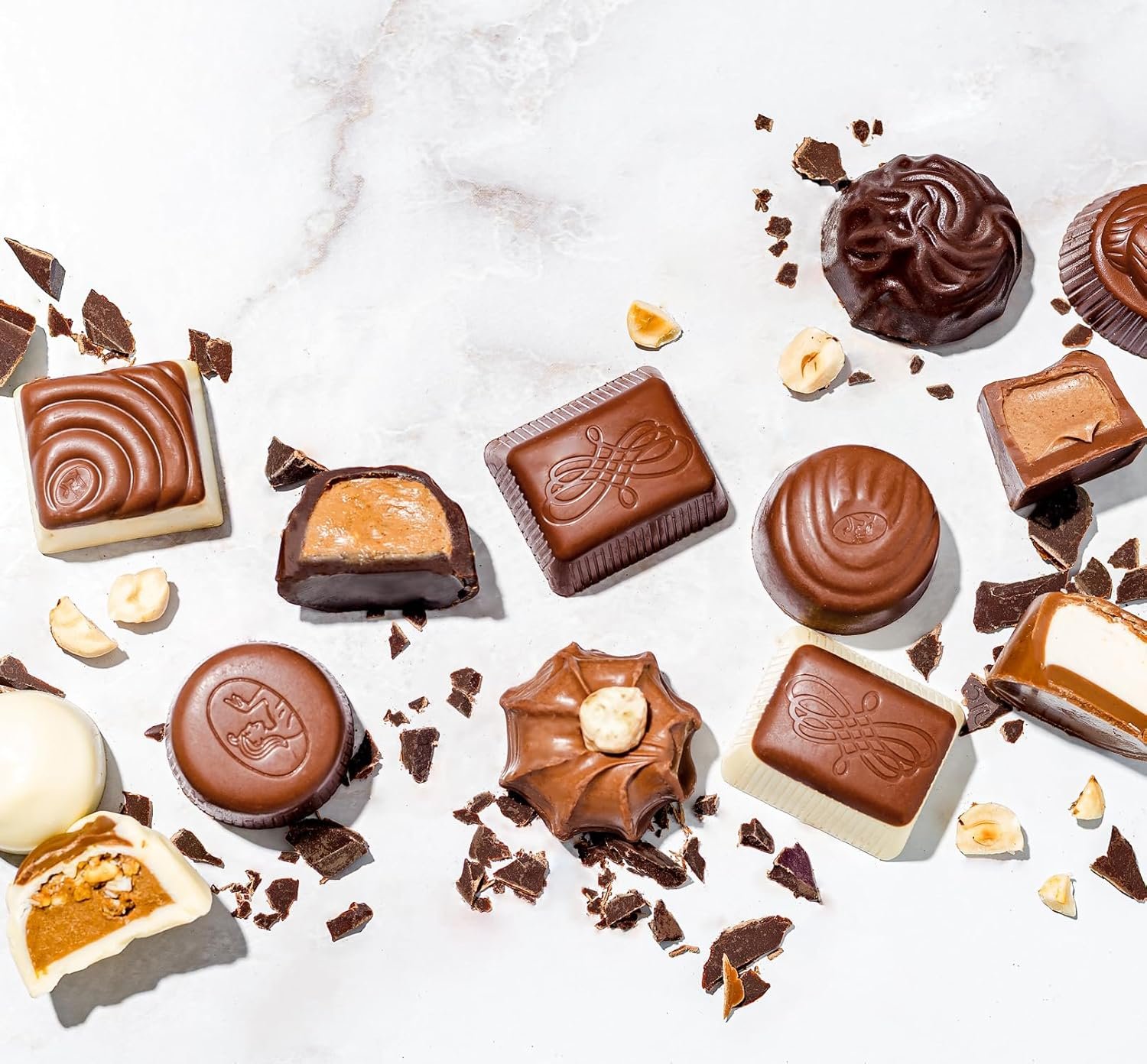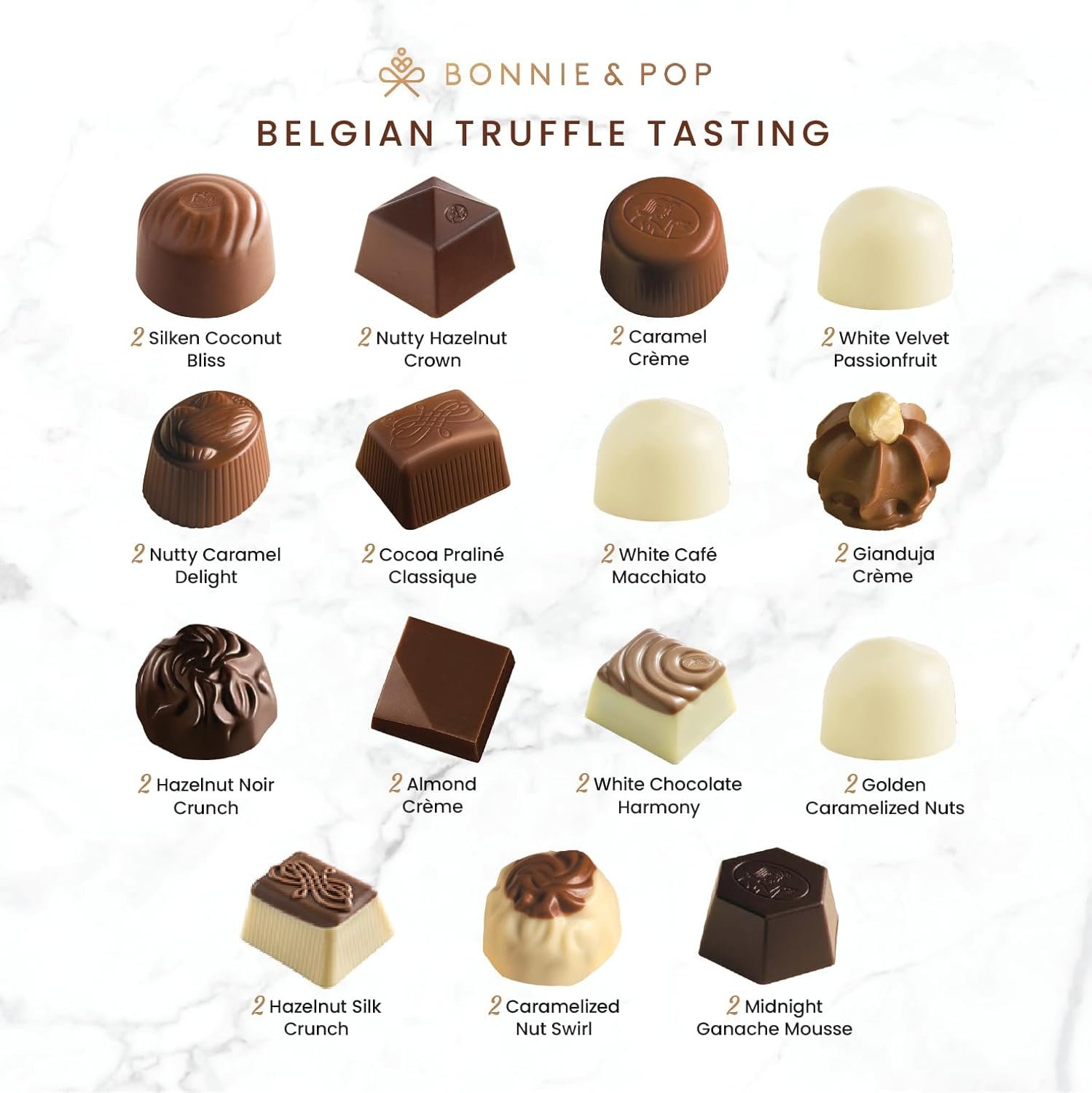 Belgian Chocolate Truffle Box with 32 Rich Chocolate Truffles- Includes silky smooth truffles in decadent varieties like mocha, raspberry, coconut, caramel, and more. Each piece individually wrapped for freshness.
