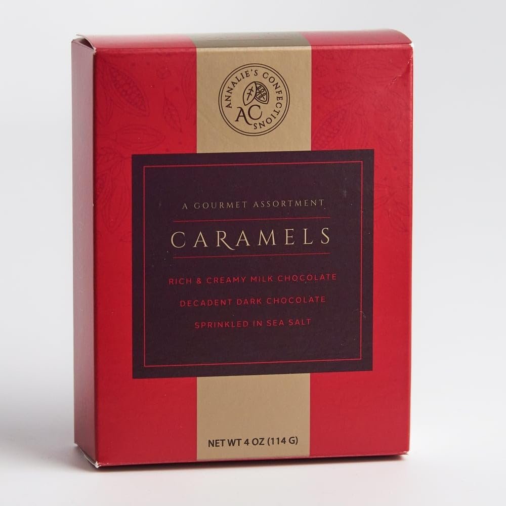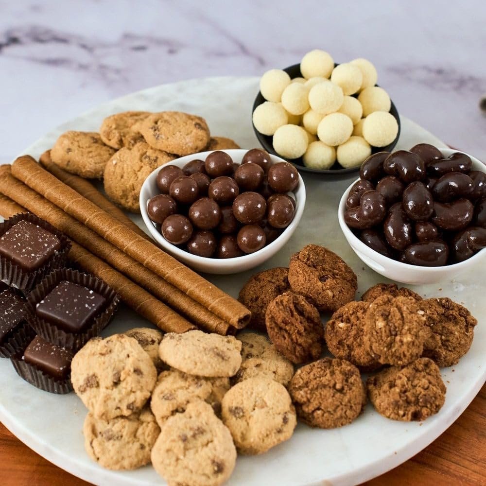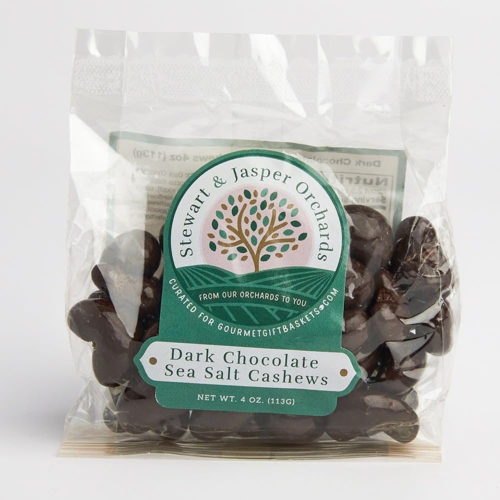 Gourmet treats include chocolate caramels (4.4 oz), chocolate chip cookies (4 oz), chocolate wafer cookies (6 oz), mudpuppies cookies (4 oz), cocoa dusted almonds (4 oz), chocolate caramel grahams (2.6 oz), dark chocolate sea salt cashews (4 oz), peanut butter pretzel poppers (4.5 oz), peanut butter chocolate chip cookies (2 oz), and white chocolate covered sugar cookie bites (4 oz)!