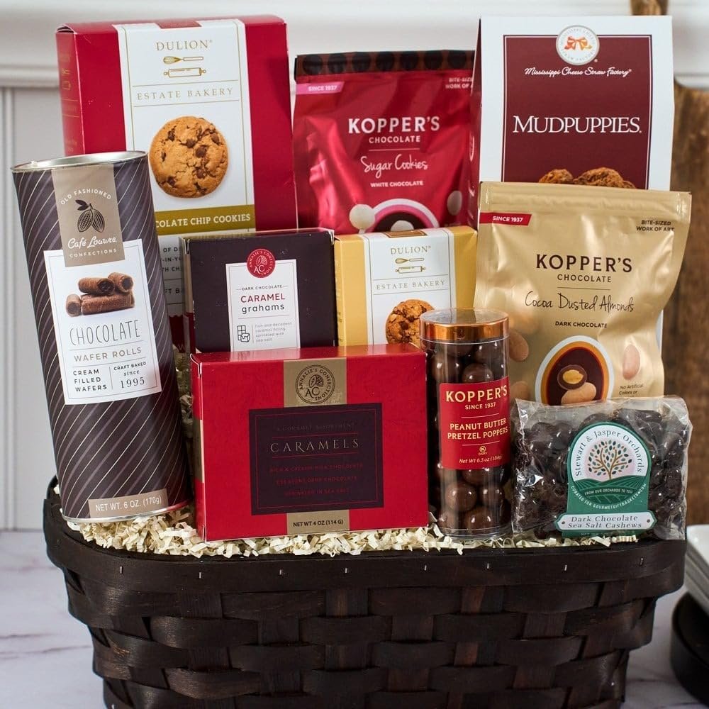 Keepsake basket with chocolate treats is professionally sealed with a festive ribbon. Perfect as a food gift basket for friends, family, clients, and coworkers as a birthday gift, thank you gift, sympathy gift, congratulations gift, and any occasion!