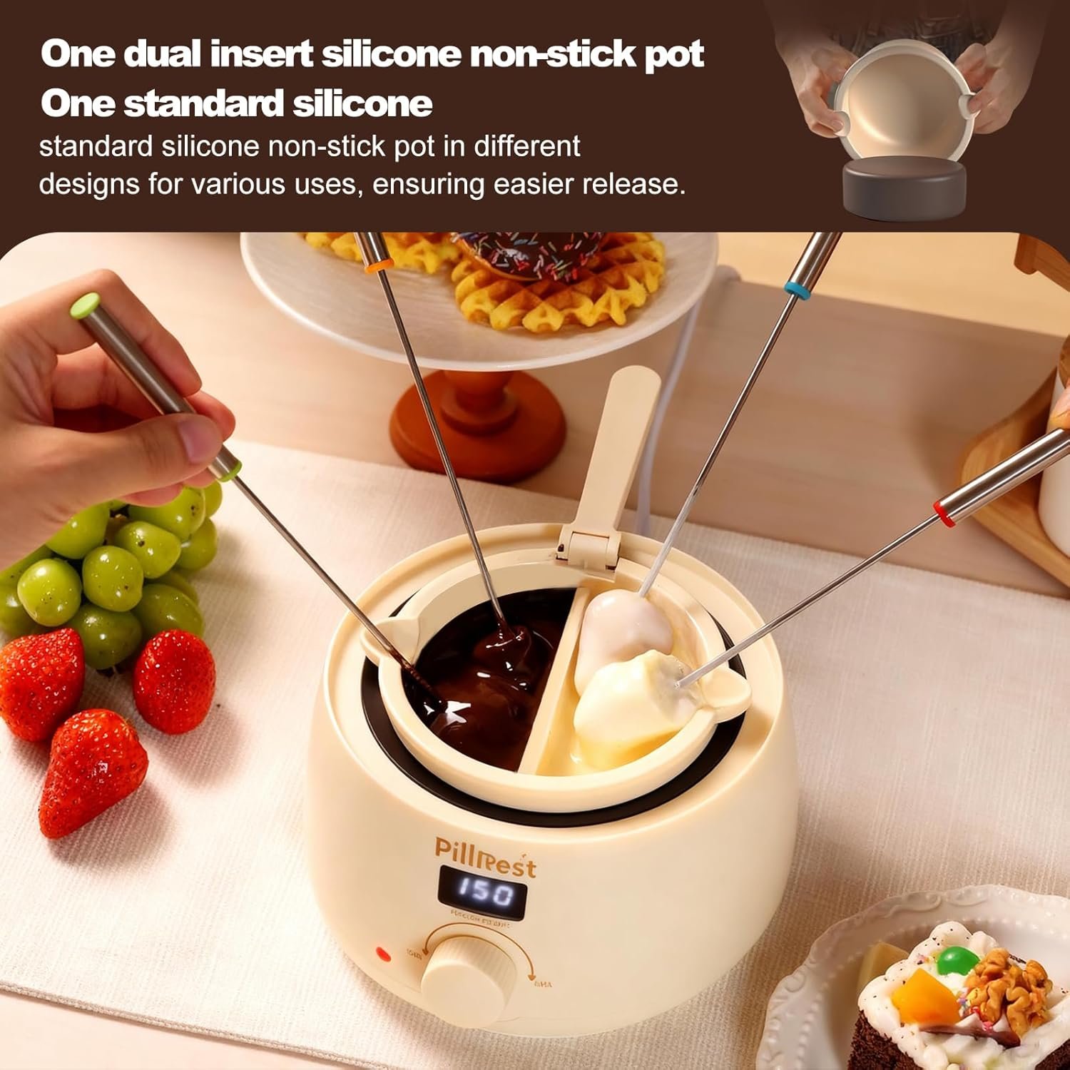 🍽️ Complete Set, Ready to Use: This complete fondue pot set includes 2 dedicated silicone bowls, 4 colorful dipping forks, 1 practical spatula, and 1 inspirational recipe guide full of creative ideas for cakes, fruits, and desserts. The innovative dual-bowl design lets you melt milk and dark chocolate at the same time, or prepare two different flavored fondue dips effortlessly. Enjoy the ultimate chocolate experience, whether you’re using it as a mini fondue pot or a chocolate melting pot.