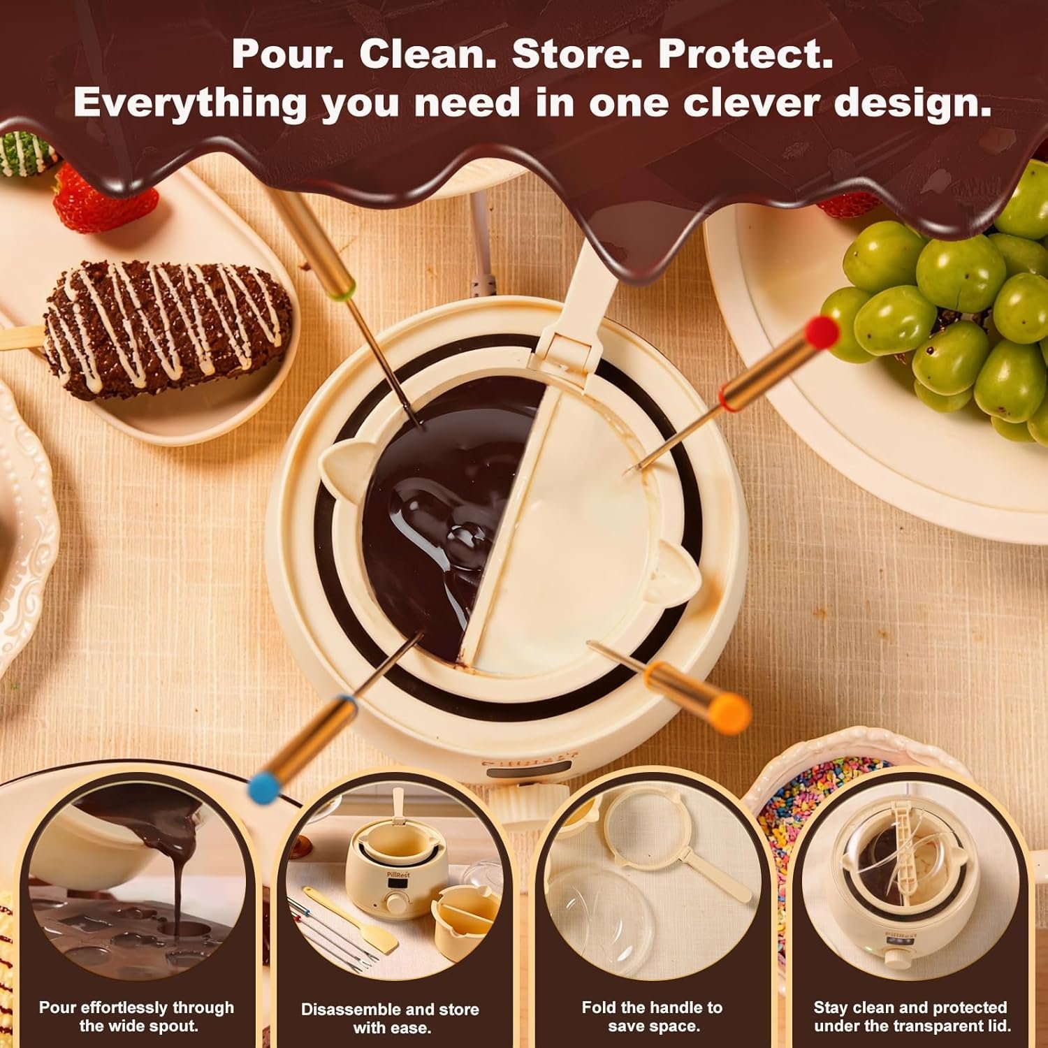 ⚡ The Ultimate No-Mess Design:Hate cleaning up your chocolate melter pot? We’ve solved it! The flexible silicone pot liner releases hardened chocolate effortlessly — simply pop it out like an ice cube! For a quick clean, just wipe or toss it in the dishwasher. No scrubbing, no hassle — so you can enjoy your fondue machine creations, not the cleanup.a holiday gift for anyone who loves compact home gadgets.