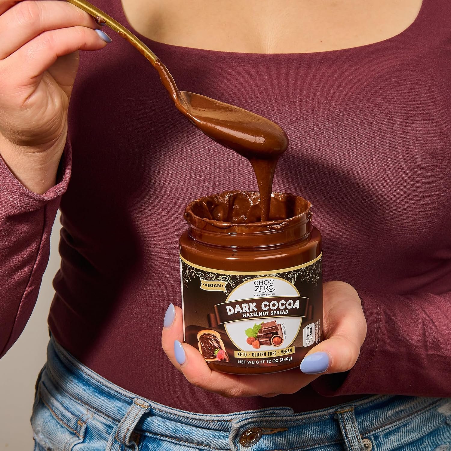ChocZero’s vegan chocolate hazelnut spread. Dark, rich and no added sugar chocolate mixed in with healthy roasted filberts
