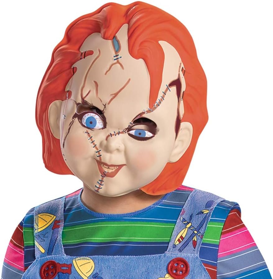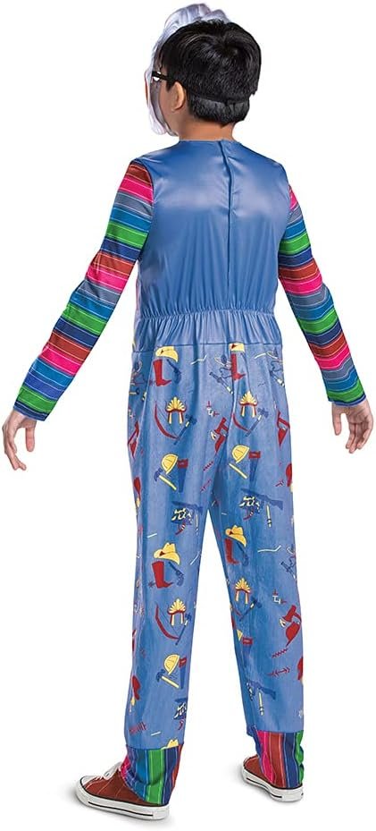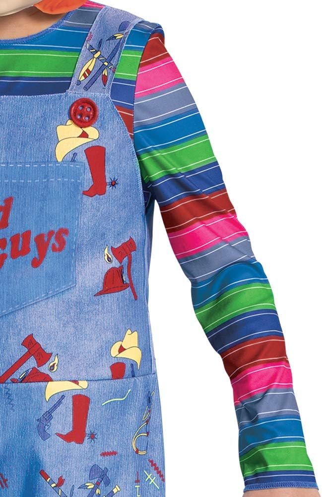 Creep out your family and friends this Halloween in our awesome Chucky Classic costume! This costume is so fun to wear and is sure to be a hit wherever you go. The jumpsuit features long sleeves with Chucky’s signature stripe detail, denim textured overalls with sublimated art all over and more stripe detail at the pant cuffs. It also has dimensional, red, foam buttons at the top. A Chucky half mask is included to complete the look! Don’t miss out on being Chucky this year!