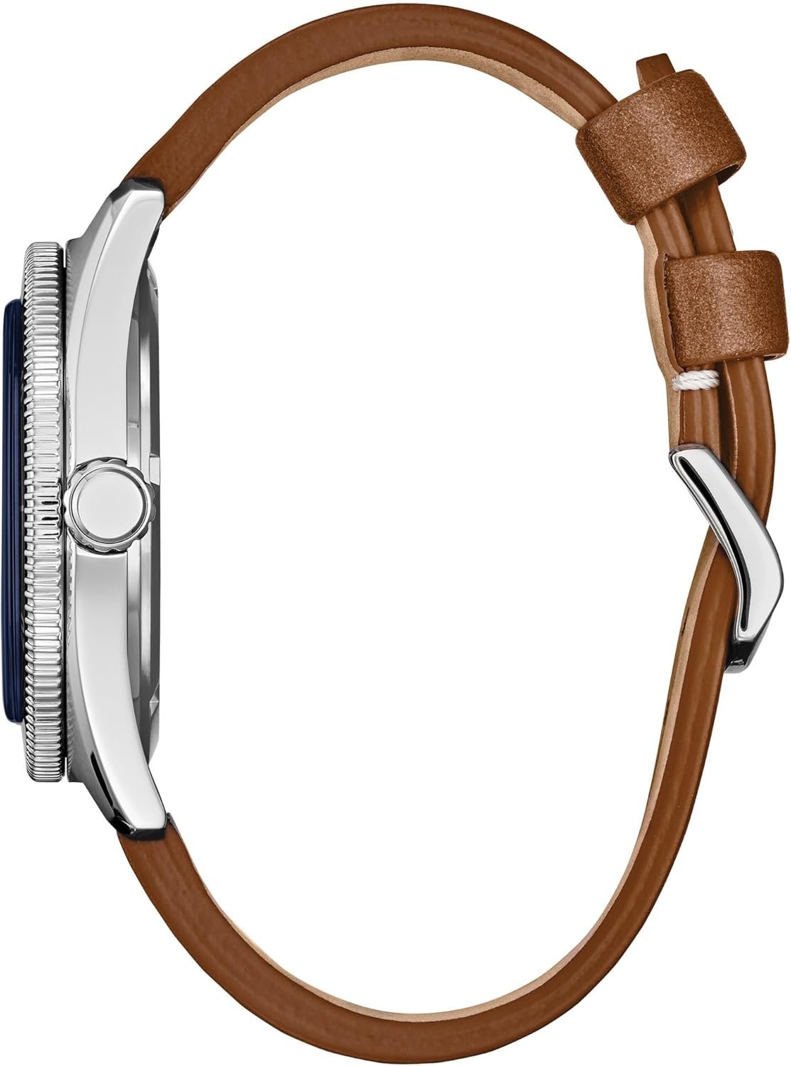 Casual styling for an everyday favorite. Featuring a stainless steel case and brown leather bracelet, Citizen’s Brycen features a blue dial with a 3 hand date function. Sustainably powered by any light with our proprietary Eco-Drive technology that never needs a battery, this modern classic Brycen men’s watch is the perfect casual look with high-powered performance. Water resistant to 100 meters.