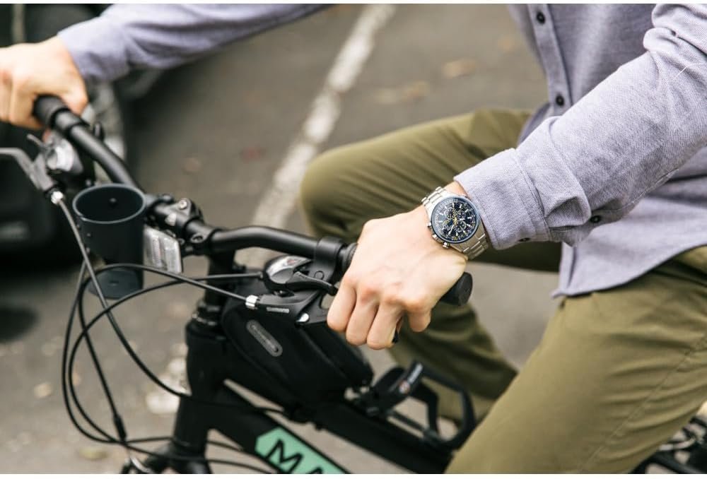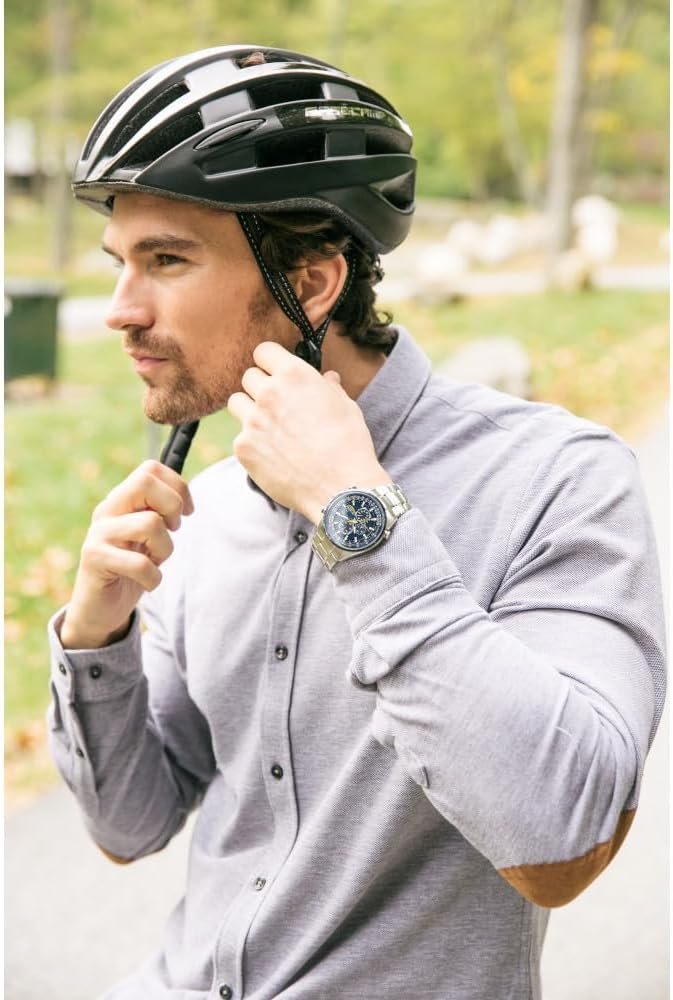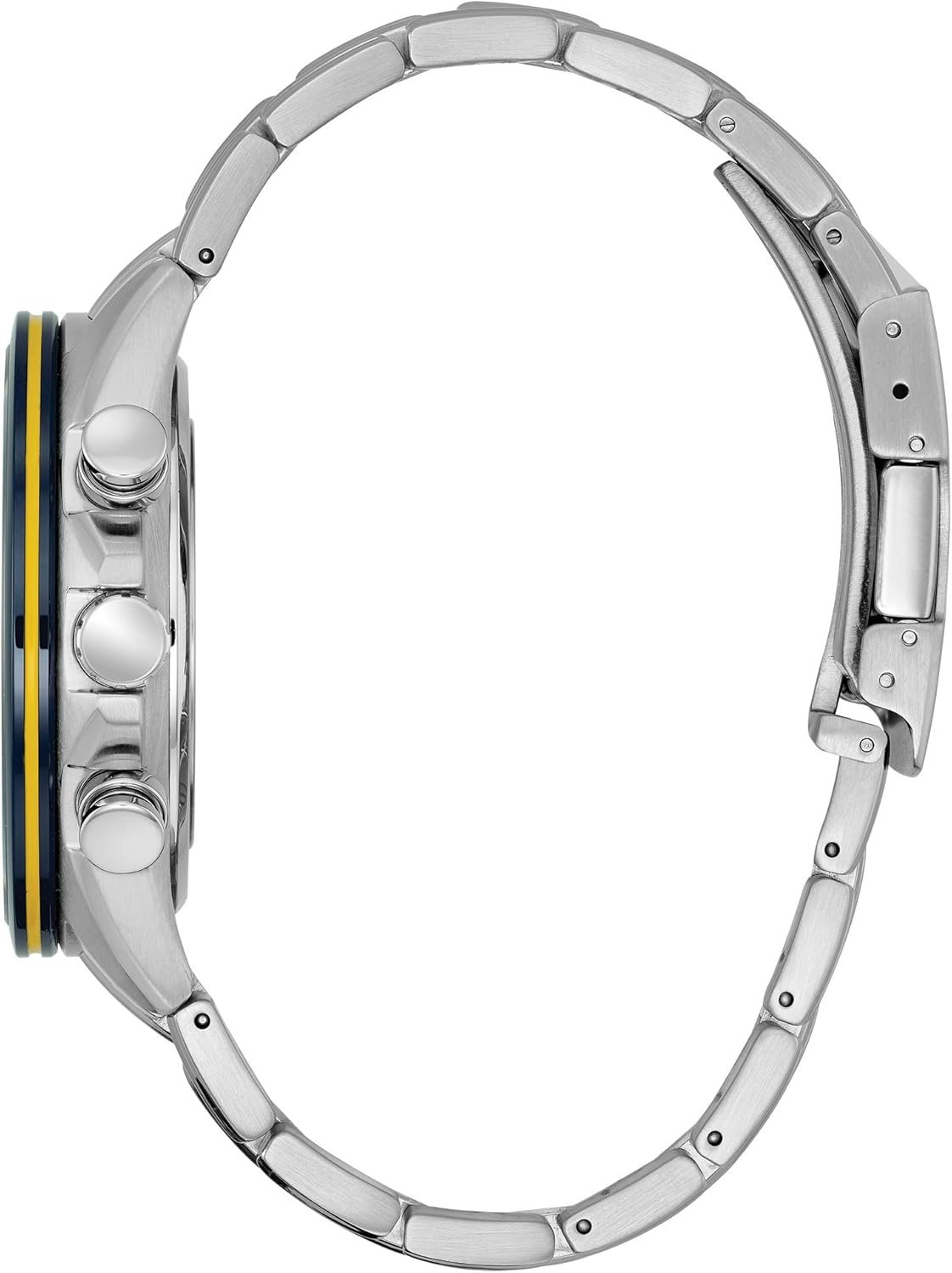 Citizen Eco-Drive Radio-Controlled Chronograph World Timer; Blue Angels edition with caseback insignia. Atomic time in 26 world cities; radio-controlled accuracy in 5 zones. 1/20 second chrono measures up to 60 minutes, perpetual calendar, 12/24 hour time, power reserve, non-reflective sapphire crystal. Stainless steel with blue ion plating. Featuring our Eco-Drive technology – powered by light, any light. Never needs a battery. Caliber number H800.