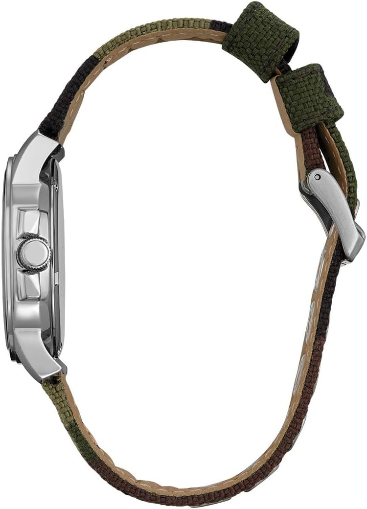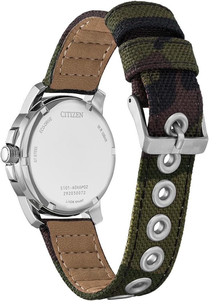 A casually styled everyday favorite complete with a black dial, stainless -steel case and camouflage nylon strap. Features include day and date functions. Water resistant to 50 meters. Powered sustainably by Eco-Drive technology – batteries not required.