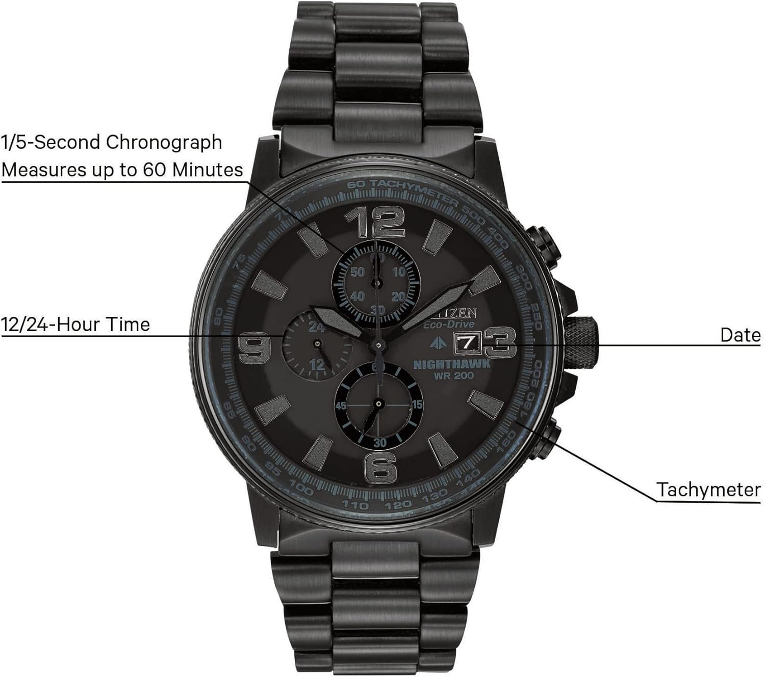 Master monochromatic style with the “Blackout” Nighthawk. The sporty design will strike up a conversation with its distinctive look in all black ion-plated stainless steel and with advanced features, including the 1/5 second chronograph that measures up to 60 minutes, 12/24 hour time and a tachymeter that measures speed based on time traveled over a distance. It also has screw-back case, a bracelet with safety foldover clasp with push button, and water resistant to 200 meters. Featuring our proprietary Eco-Drive technology that’s sustainably powered by any light and never needs a battery, this versatile watch stands out is essential for every man’s weekday to weekend wardrobe. Caliber number B612.