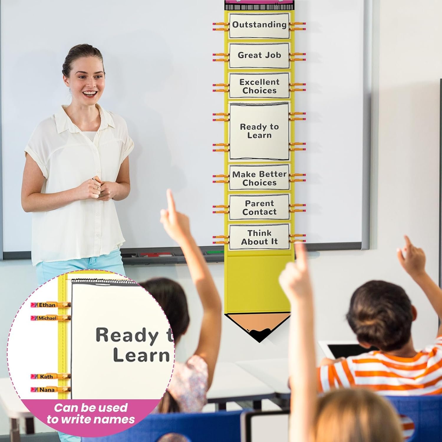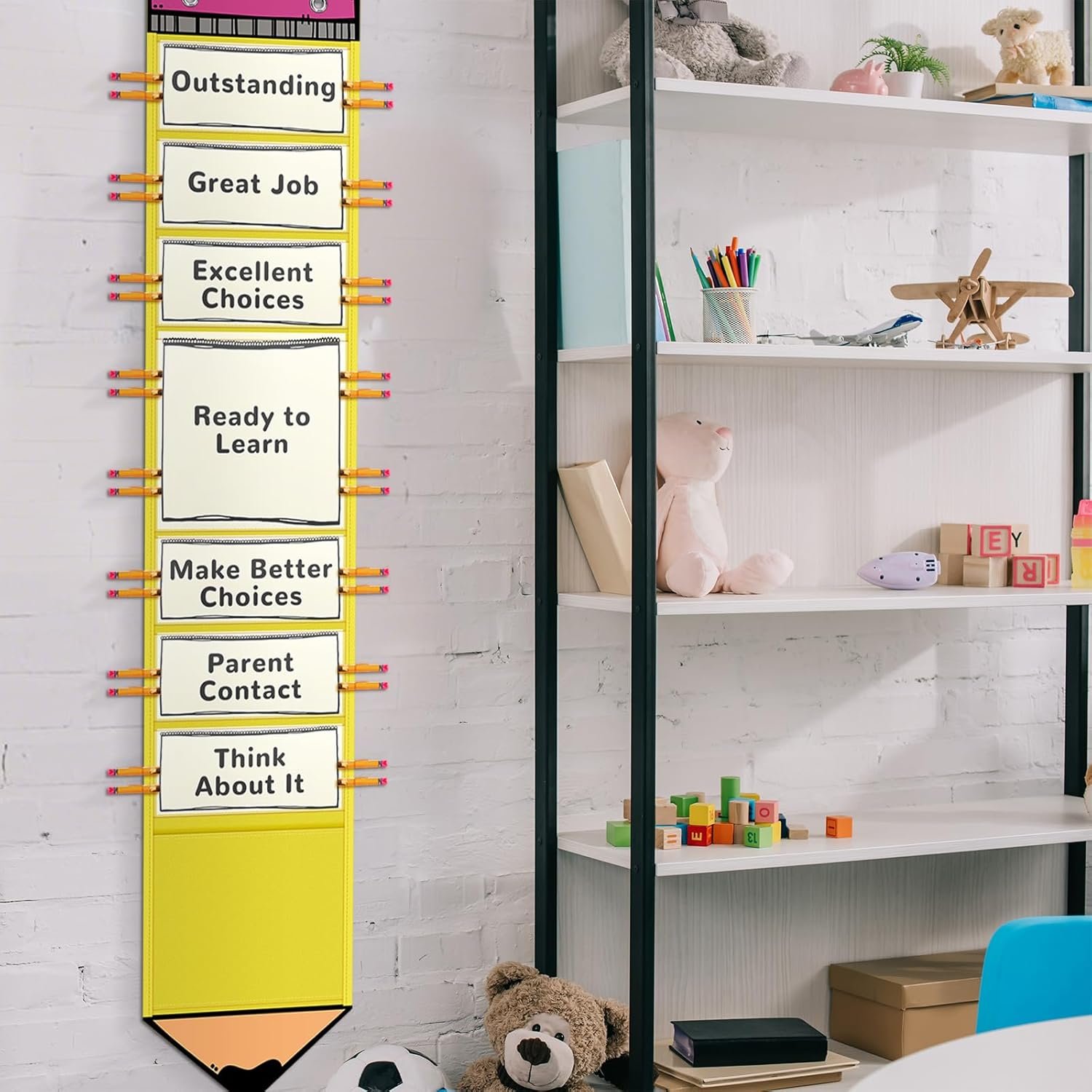 Classroom management effortlessly with this innovative and creative bulletin board. The pencil shape and bright colors are not just visually appealing, but they also serve as a motivational tool that promotes student engagement. With the classroom management chart, teachers can efficiently track student behavior and achievements, maintaining a harmonious and productive learning environment. Its thoughtful design supports effective teaching strategies and helps manage classroom dynamics smoothly.