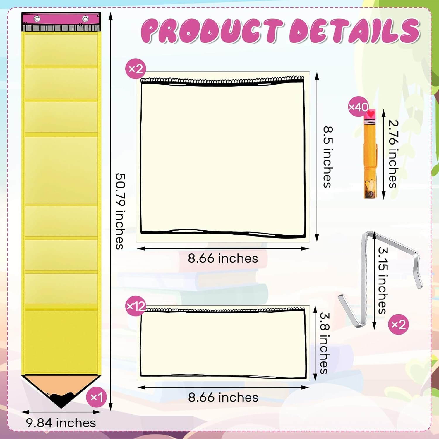 Product List: this set of classroom management charts has a total of 55 pcs, including 1 hanging 7 clear pockets and 1 storage bag foldable pocket pencil shape chart, 14 rewritable wipe off laminated cards not pre-printed, 40 pencil wooden clips