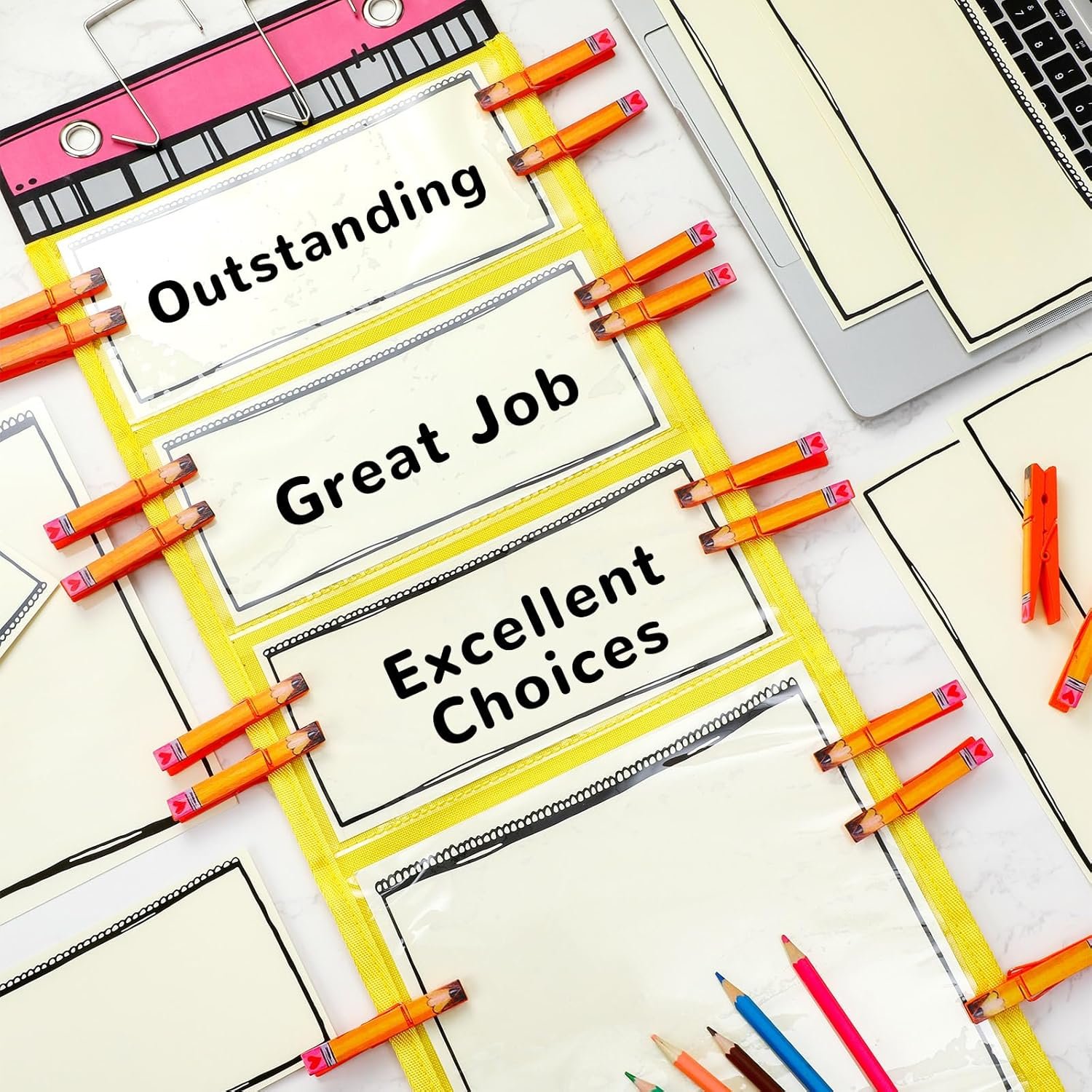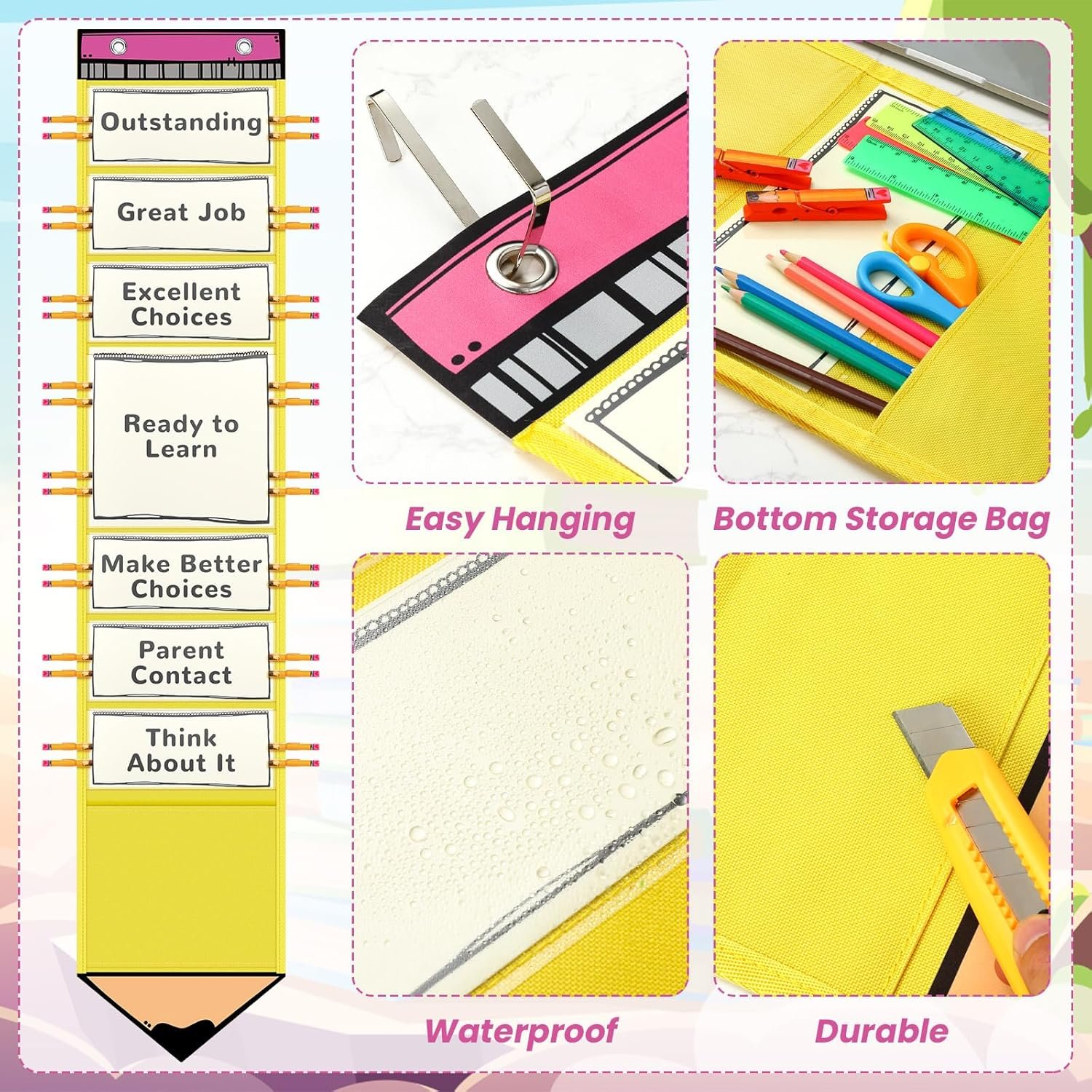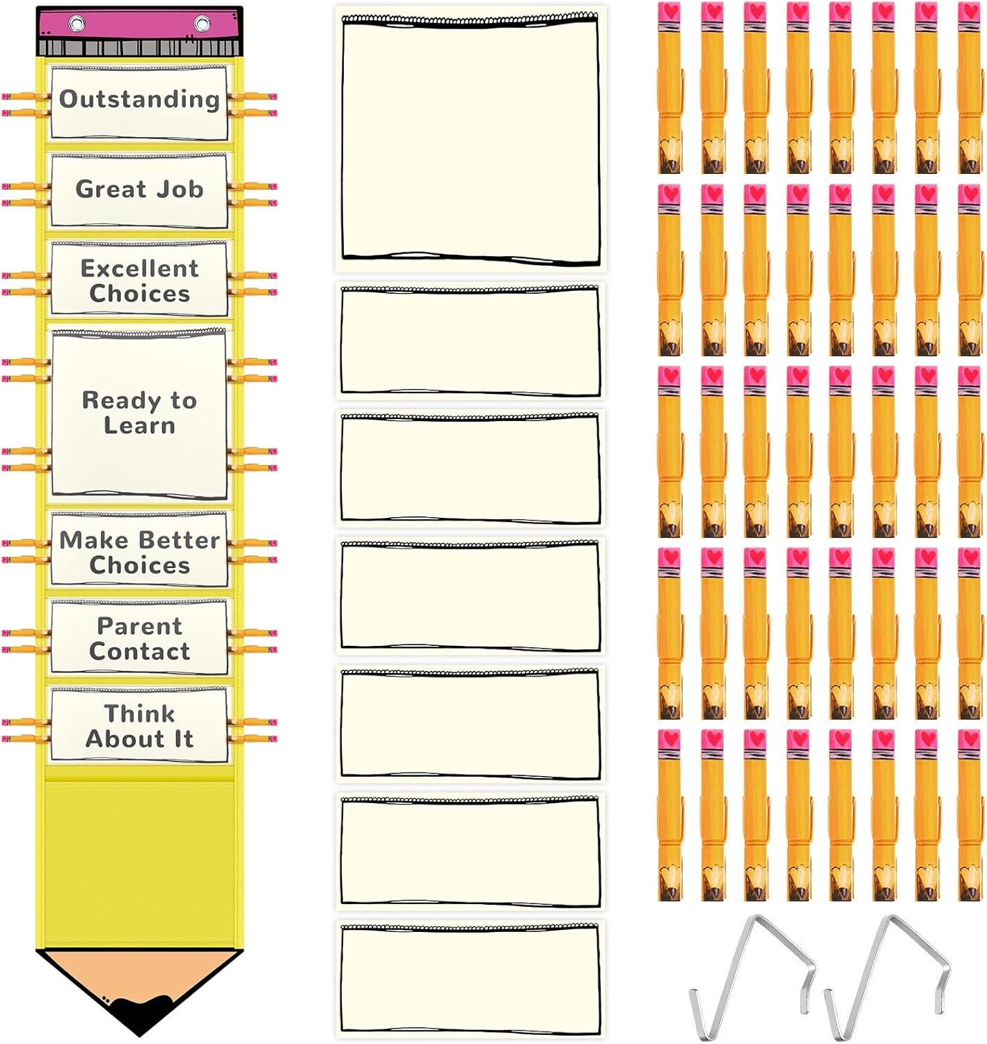 Keep your classroom organized and motivated with this versatile behavior chart for the classroom. The set includes a total of 55 pieces, featuring 7 clear pockets for easy access and visibility of student tasks and achievements. With 40 sturdy pencil wooden clips, students can easily attach, making participation straightforward and fun.