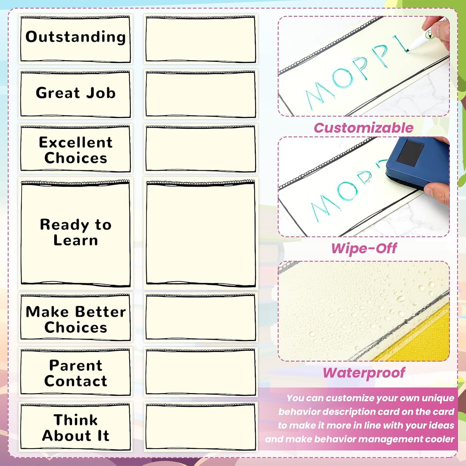 DIY Design: you can customize your own behavior description card on the card to make it more in line with your ideas and make behavior management cooler; Maximum flexibility, accurately track the classroom management you need, and keep students motivated