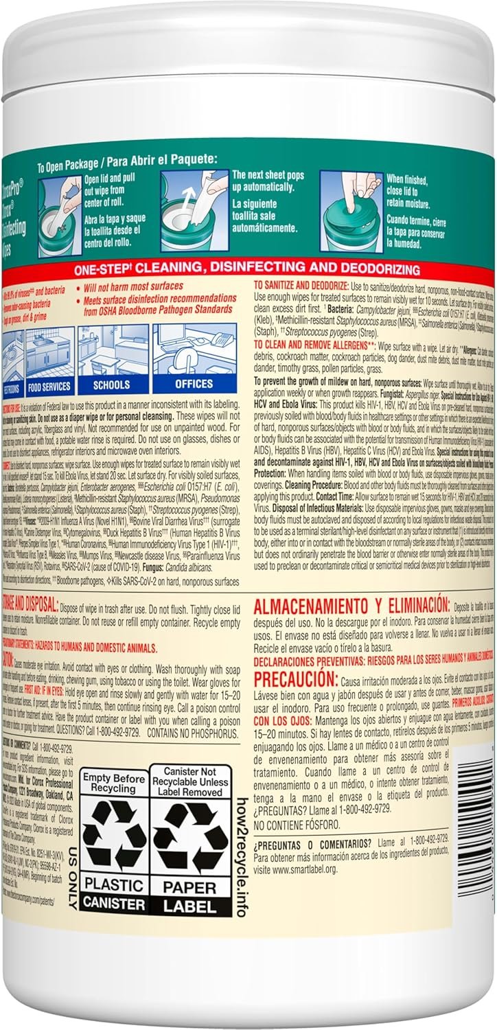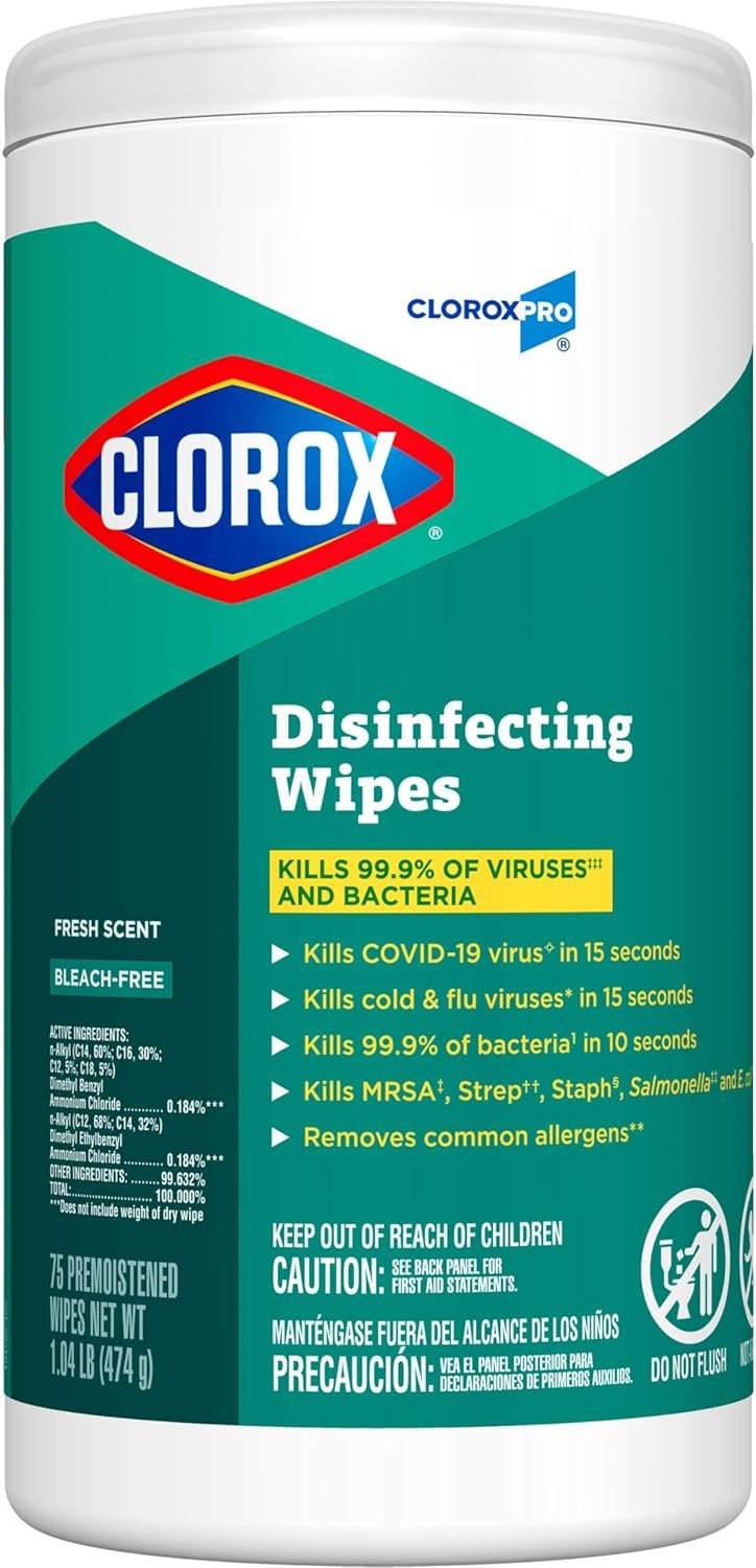 Clorox Disinfecting Wipes clean and disinfect in one easy step*. These sanitizing wipes are EPA-registered to kill 99.9% of germs including cold and flu viruses* in 15 seconds. They also remove common allergens like pet dander, pollen particles and grass. One antibacterial wipe can kill 99.9% of bacteria** in just 10 seconds. In addition, these wipes meet EPA criteria for use against SARS-CoV-2, the virus that causes COVID-19, on hard nonporous surfaces. The premoistened, textured wipes are suitable for a variety of surfaces including acrylic, glass and vinyl. Use on germ hot spots such as doorknobs, handrails and faucets. Ideal for offices, daycares, schools, hotels, restaurants and more. Do not flush. *When used according to disinfection directions. **Bacteria: Campylobacter jejuni, Escherichia coli O157:H7 (E. coli), Klebsiella pneumoniae (Kleb), Methicillin-resistant Staphylococcus aureus (MRSA), Salmonella enterica (Salmonella), Staphylococcus aureus (Staph), Streptococcus pyogenes (Strep).