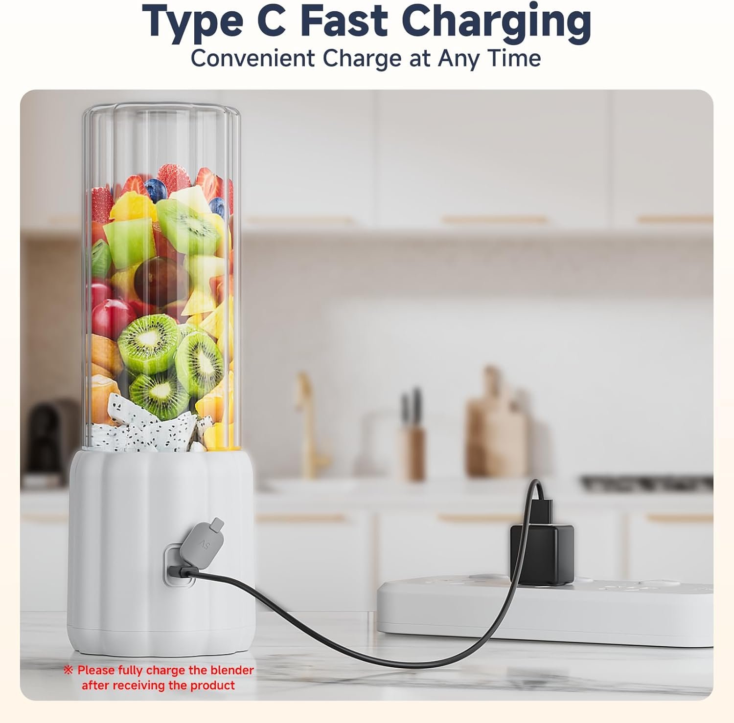 RECHARGEABLE & POWER DISPLAY: Stay powered on the go with the USB-C rechargeable battery. The 4-LED indicator provides real-time battery status, ensuring you’re never caught off guard. Please fully charge the personal juicer blender before first use