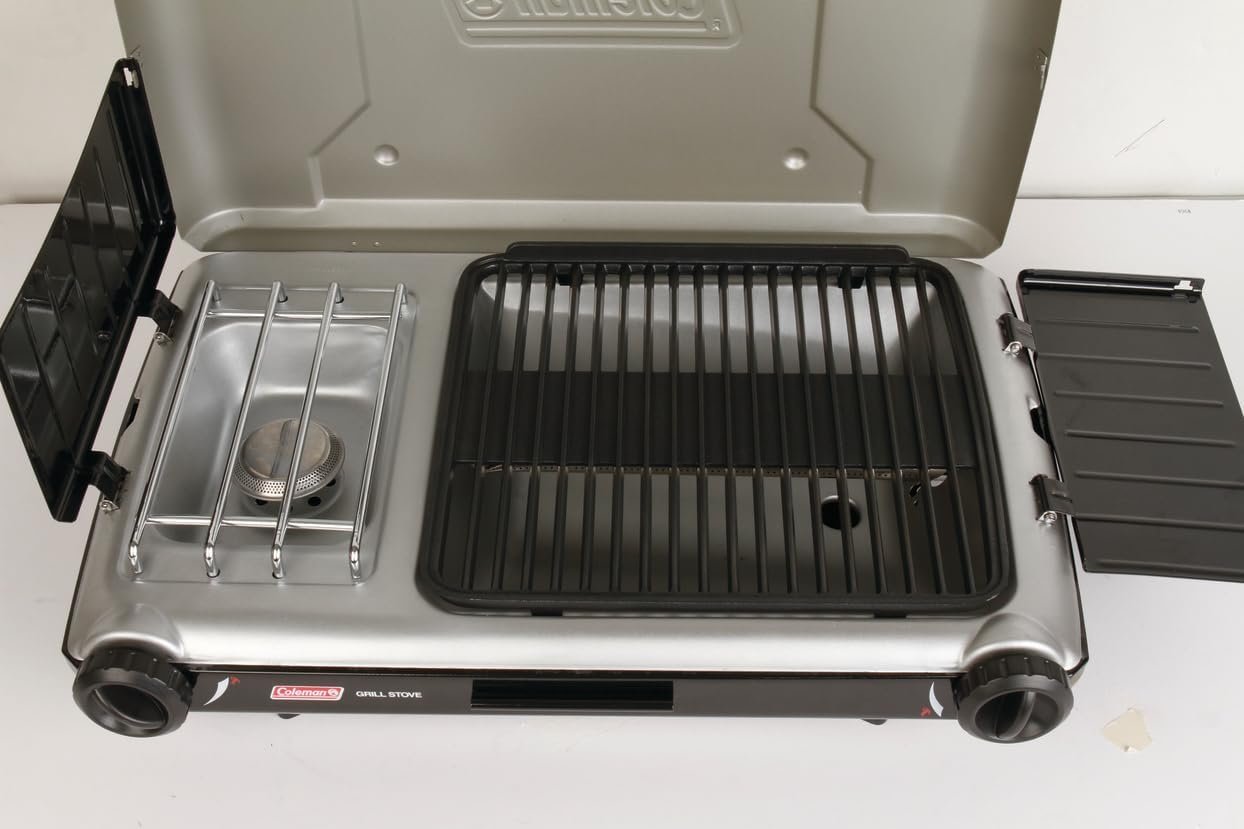 Cook and grill simultaneously with the Coleman Tabletop Propane Gas Camping 2-in-1 Grill/Stove, 2-Burner. Thanks to the Instastart push-button ignition system for matchless lighting, you’ll be cooking with up to 20,000 total BTUs in no time. The stove surface fits a 10-inch pan, and the 130-square-inch grill area leaves plenty of room for grilling. WindBlock panels help shield your flame from wind, and they also fold down to use as side tables. All of this in one compact design that sets up easily at the campsite, tailgate, or in your backyard.