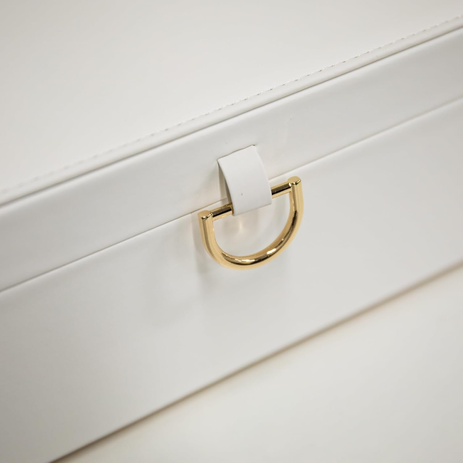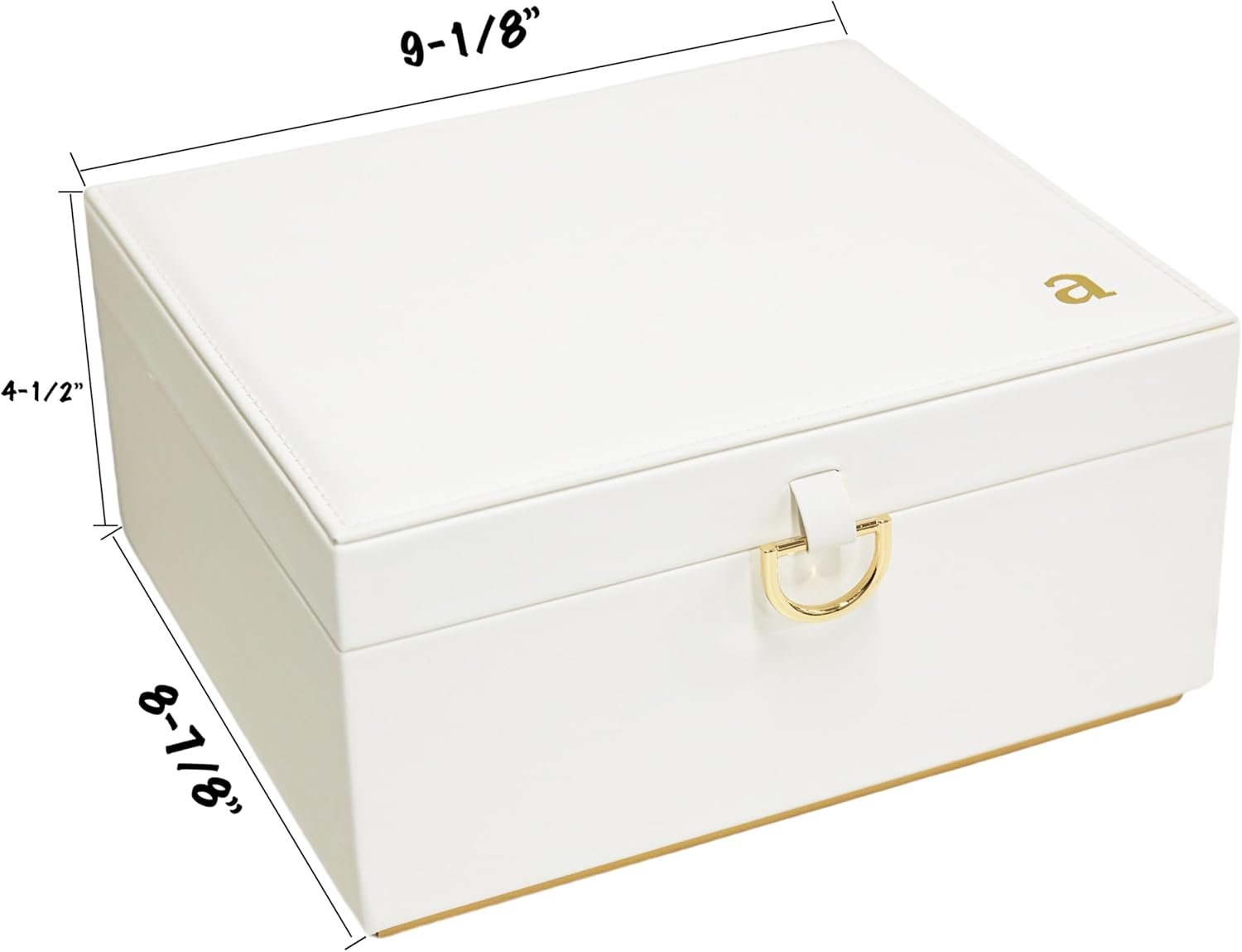 【Timeless Elegance with Personalized Charm】This jewelry box stands out with its luxurious white and gold design, featuring a unique gold monogram engraving on the lid for a personalized touch. The built-in mirror enhances its functionality and elegance, making it a centerpiece for any dresser.