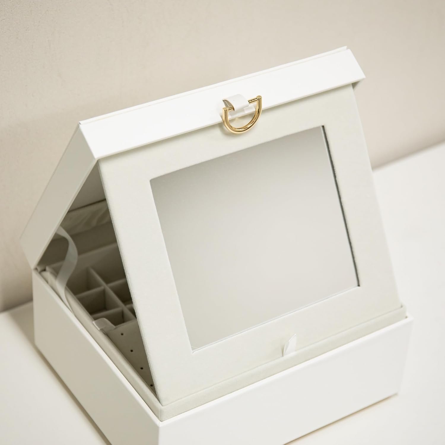 【Adaptable Design for Your Needs】The top tray includes removable dividers to accommodate larger items or reorganize as needed. A separate stud earring holder can be positioned inside the box or used independently, offering you ultimate flexibility and organization.