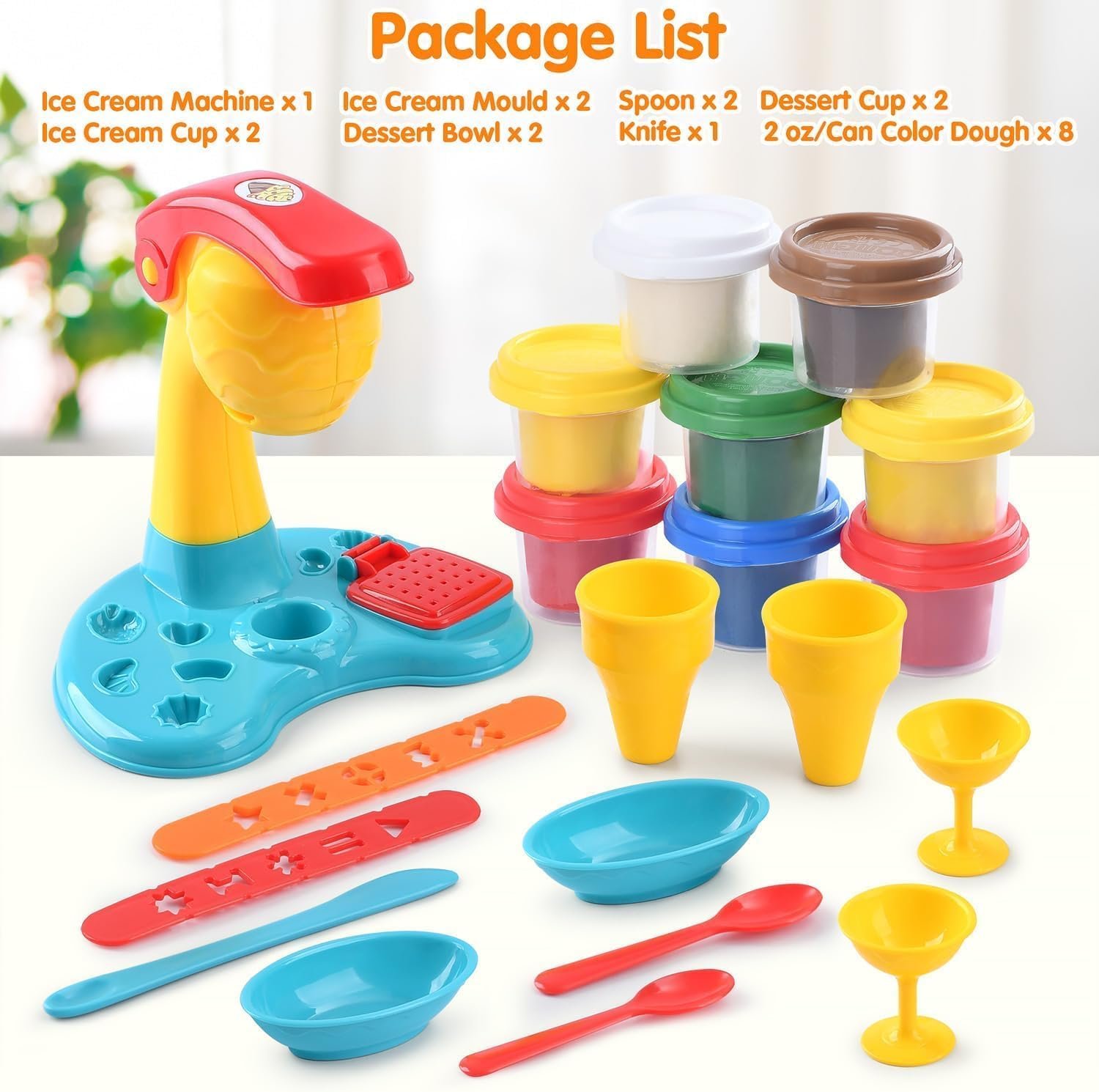 Produce Creative Ice Cream:Pretend play just got a little sweeter!This color dough playset comes with an ice cream maker,8 cans 2 oz/can color dough,2 ice cream cup,2 dessert cup,2 dessert bowl,2 spoon,1 knife and 2 mould rulers that creates a variety of ice creams and decorations.The arts and crafts for toddler kitchen creations are very appealing to kids age 4-6!