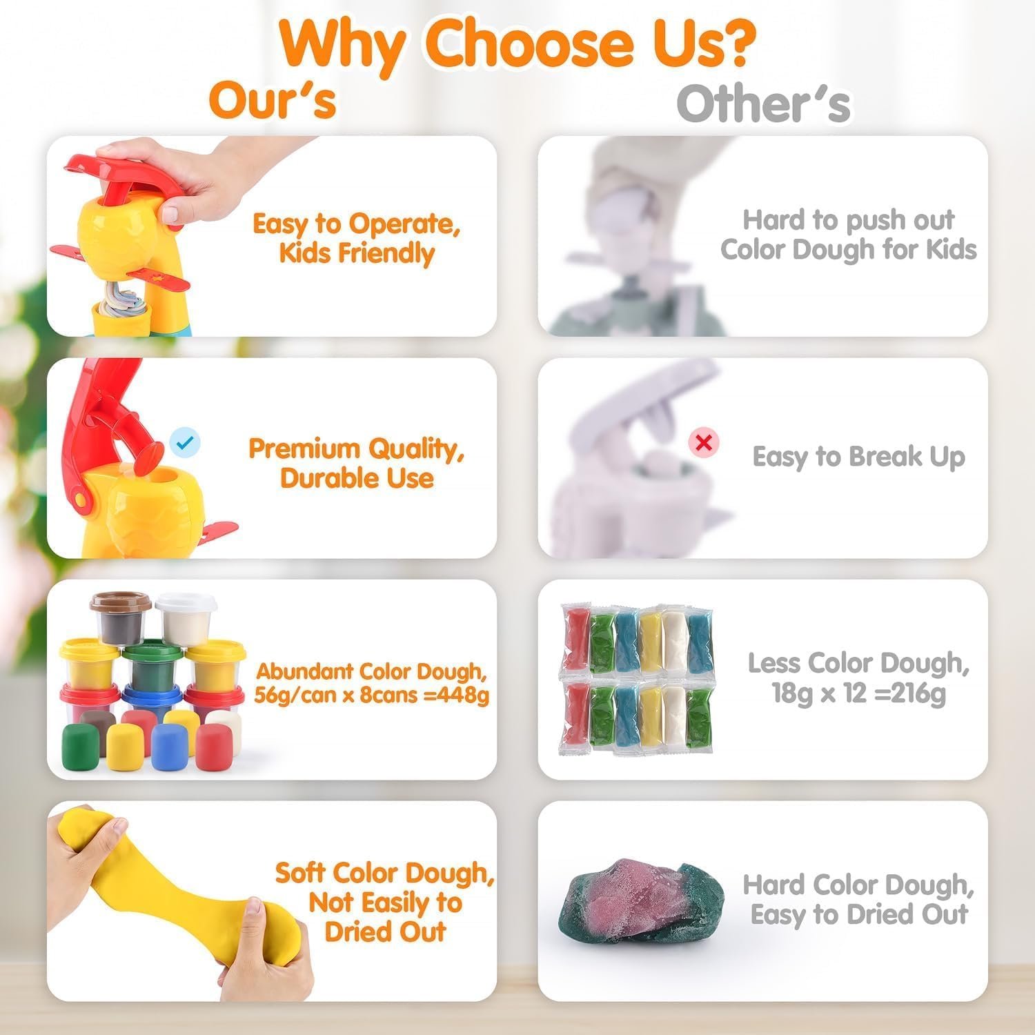 Scientific and unique ratio of raw materials, strict quality control, so that our color dough is made very soft and non-sticky hands