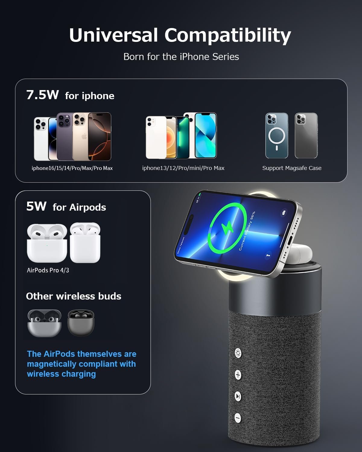 [2 in 1 Magnetic Charging Station]: 2 in 1 wireless charger for iPhone 17/16/15/14/13/12 Series, AirPods Pro 4/3/2. Fast charging 2 Apple devices at the same time. BUILT-IN Powerful magnets help you easy and accurate charging.[Make sure your headphone case supports wireless charging]