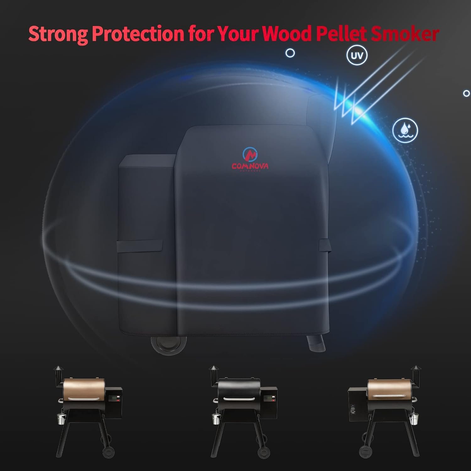 | Heavy Duty and Waterproof Cover | – Comnova wood pellet smoker covers are made of 600D heavy-duty oxford cloth with waterproof PU coating and UV-resistant coating. Compared with PVC, our outdoor pellet grill covers are softer and more breathable. Our barbecue grill covers can protect your bbq grill from heavy rain, snow, straight sunshine, tear and fading. More importantly, PU coating is more environmentally friendly!