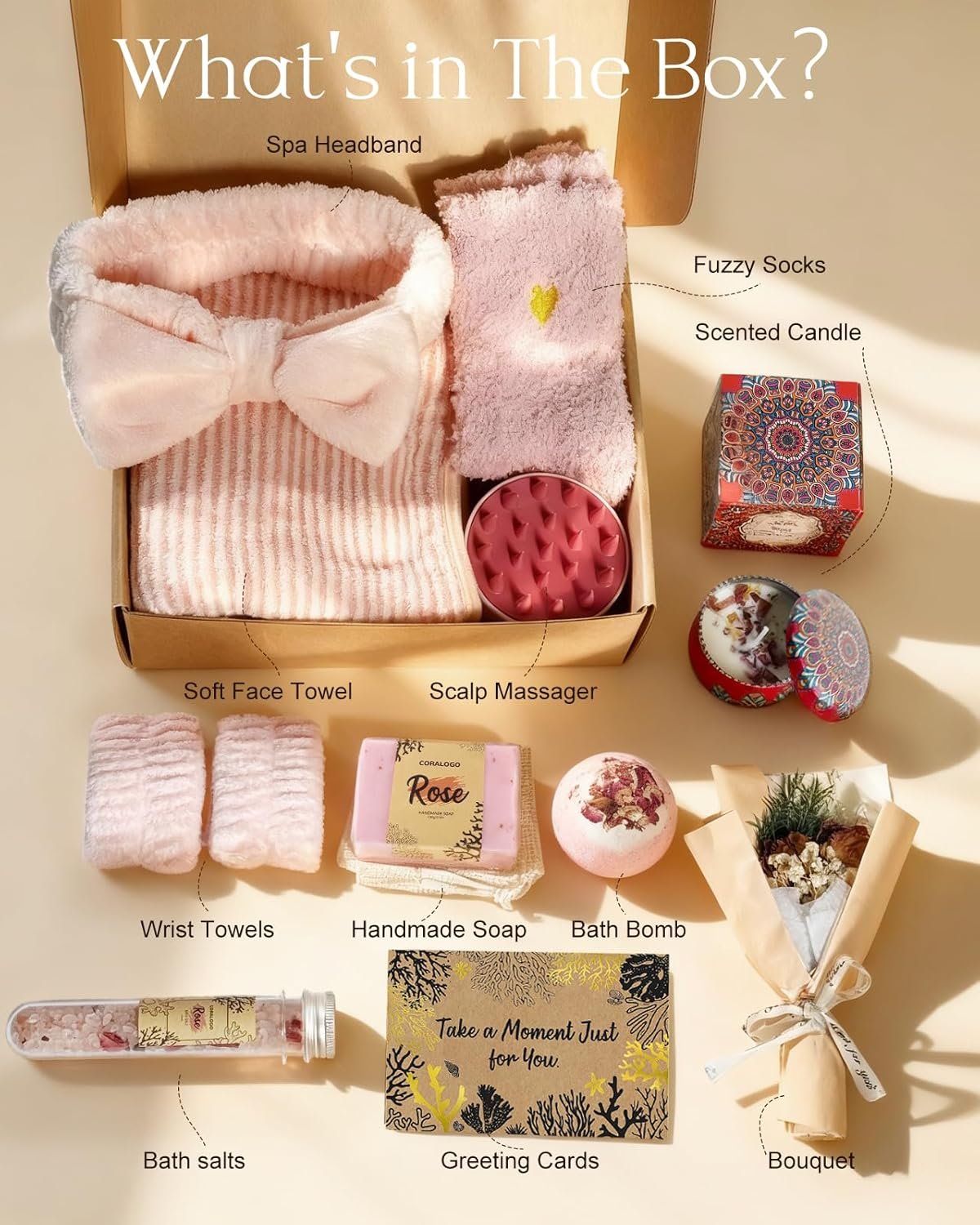 Elevate Your Gifting Game: Delight your loved ones with this 11-piece spa gift set, featuring bath bombs, bath salts, a scalp massager, a scented candle, handmade soap, a facial headband, cozy socks, a plush towel, and a blank gift card for personal messages. Ideal for any occasion, this elegant set is the ultimate way to show you care