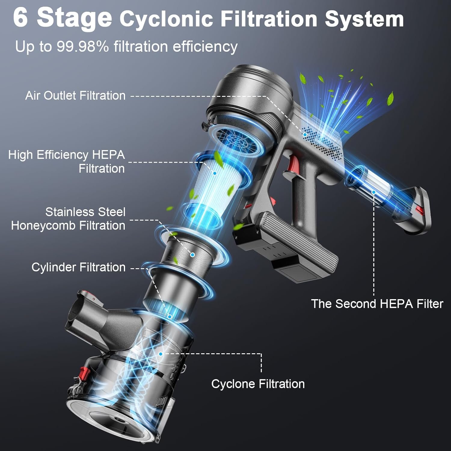 [6-Stage High-Efficiency Filtration &1.5L dust cup] : Breathe dust-free air with advanced 6-stage filtration system that captures up to 99.99% of dust particles as small as 0.1 microns.This innovative design not only extends the life of the cordless vacuum cleaner by protecting the motor, but also ensures your home stays fresh and dust-free.1.5L large capacity reduces the need for frequent emptying, and the one-button release makes the process quick and mess-free.