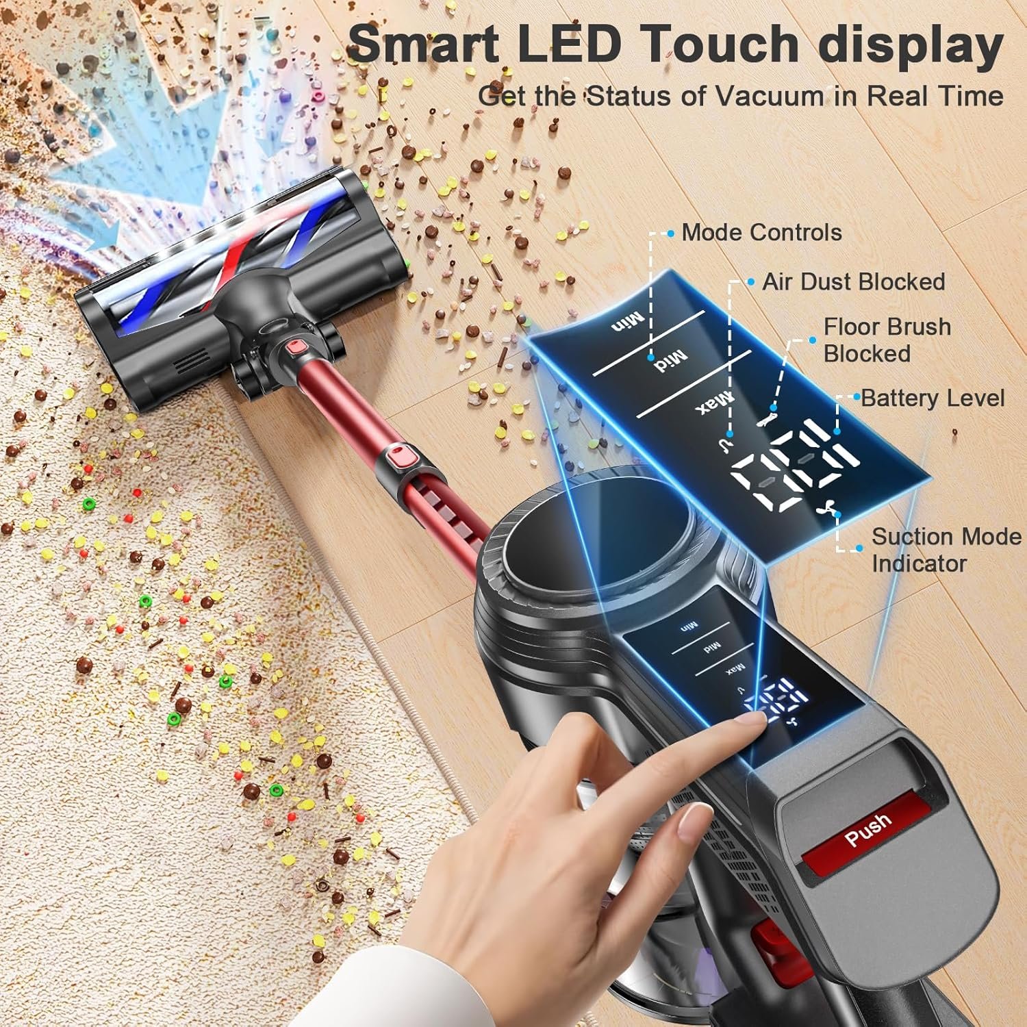 [LED Display with Smart Alerts]: This cordless vacuum features a user-friendly LED display that shows condition like sution mode, remaining power, and alerts for floor brush or air duct blockages. Stay informed and in control of your cleaning with real-time indicators that help you optimize performance and avoid interruptions.