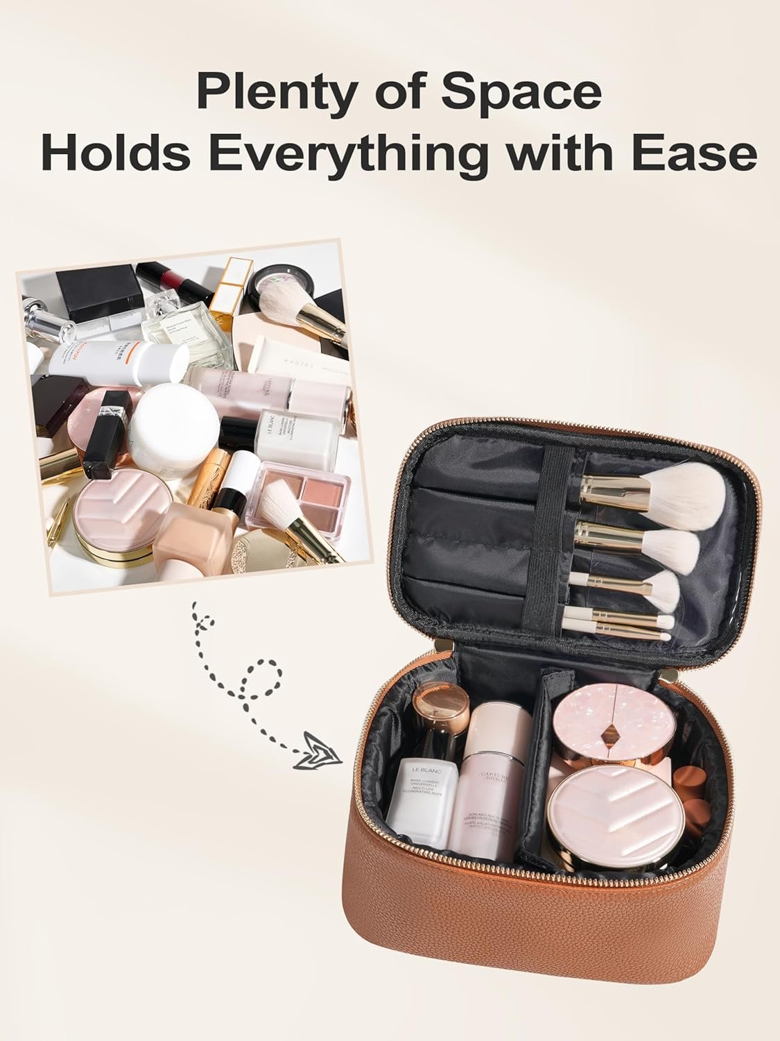 💕LARGE CAPACITY: With 4 elastic brush pockets on top are ideal for women’s brush, mascara, eyeliner, and has PVC cover to keep them clean. The main compartment can storage cosmetics and skincare with a adjustable padded divider. Also offer two internal pockets for special items.