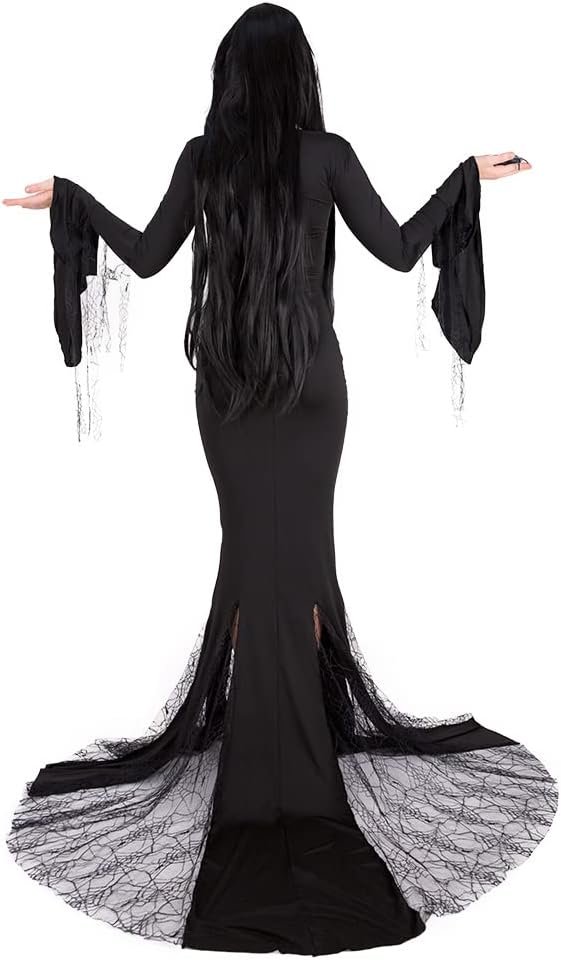 This stunning dress features a gothic design with a large train which is made up of mesh and spandex fabric patchwork, perfect for adding a touch of mystery and elegance to your look.