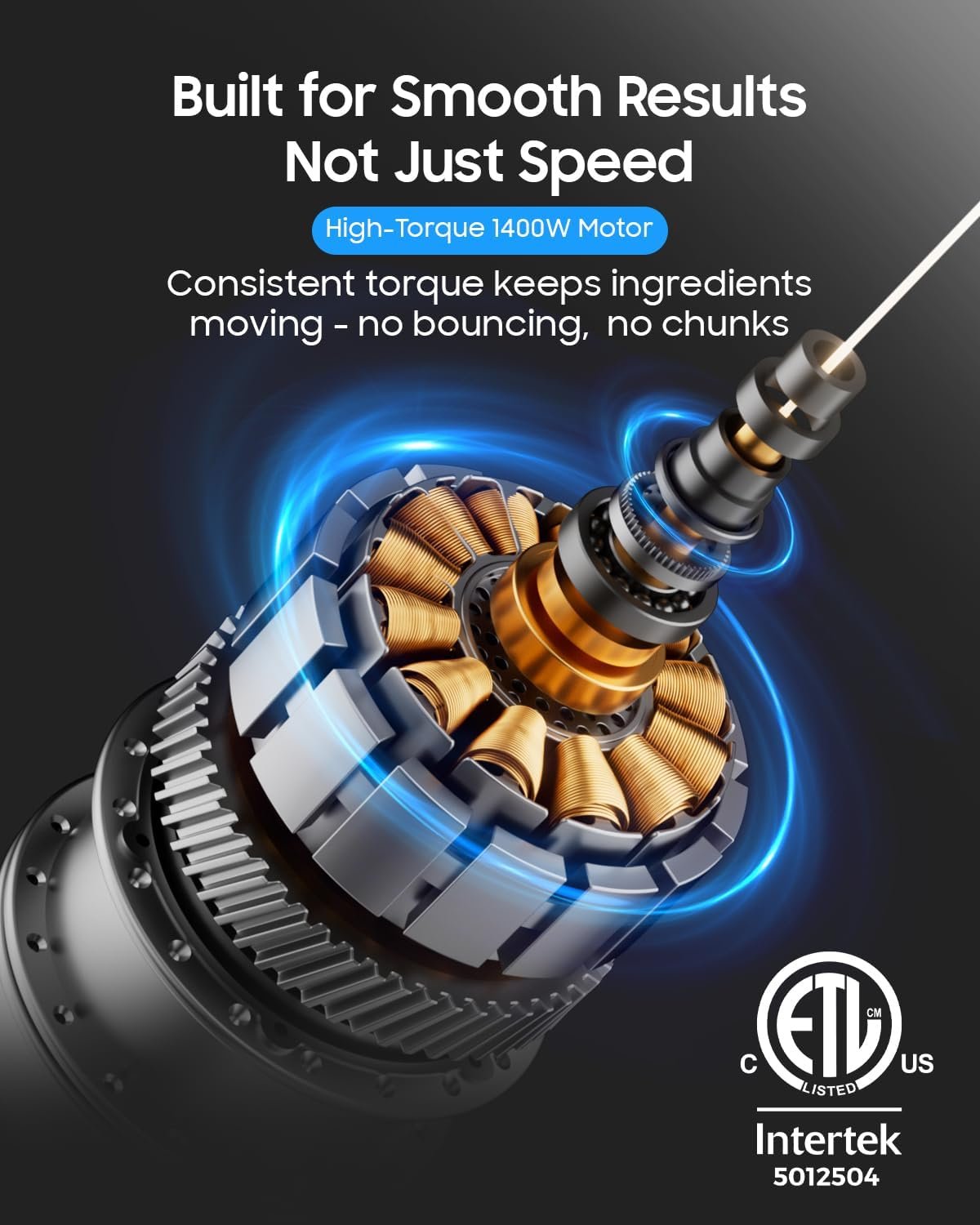 【High-Torque Power for Consistent Smoothness】Powered by a 2HP high-performance motor with Japanese Fuji Carbon technology,delivering up to 30000 RPM to maintain blending speed under load.Keeps ingredients moving smoothly to reduce bounce-back, slowdown, and grainy texture.